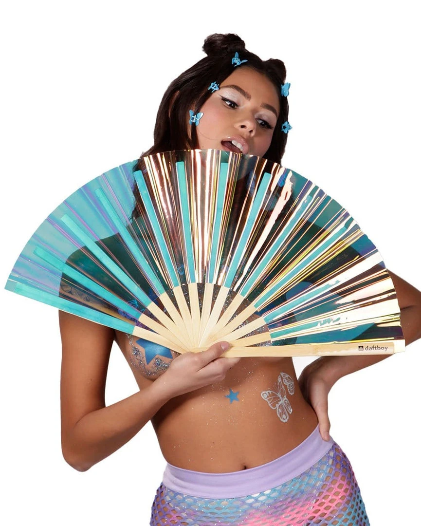 Bring life to the rave with our Daft Boy Holographic Fan. This fabulous rave fan features lightweight iridescent fabric with a Bamboo rib with a solid rivet to give the ultimate snap. Â