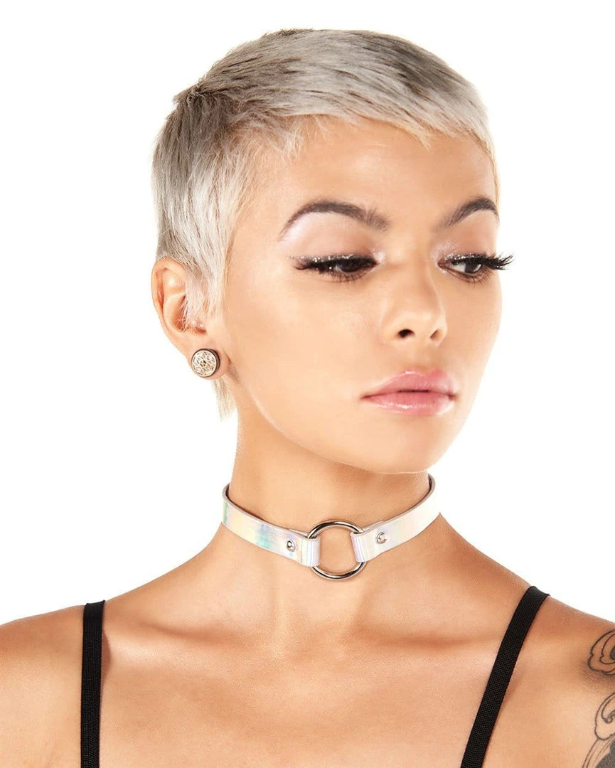 Give your outfit some shiny swagger with our Hazy Holographic Ring Choker. This silver holographic choker features a silver ring and had 3 snaps in the back for an adjustable fit.