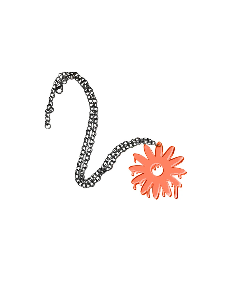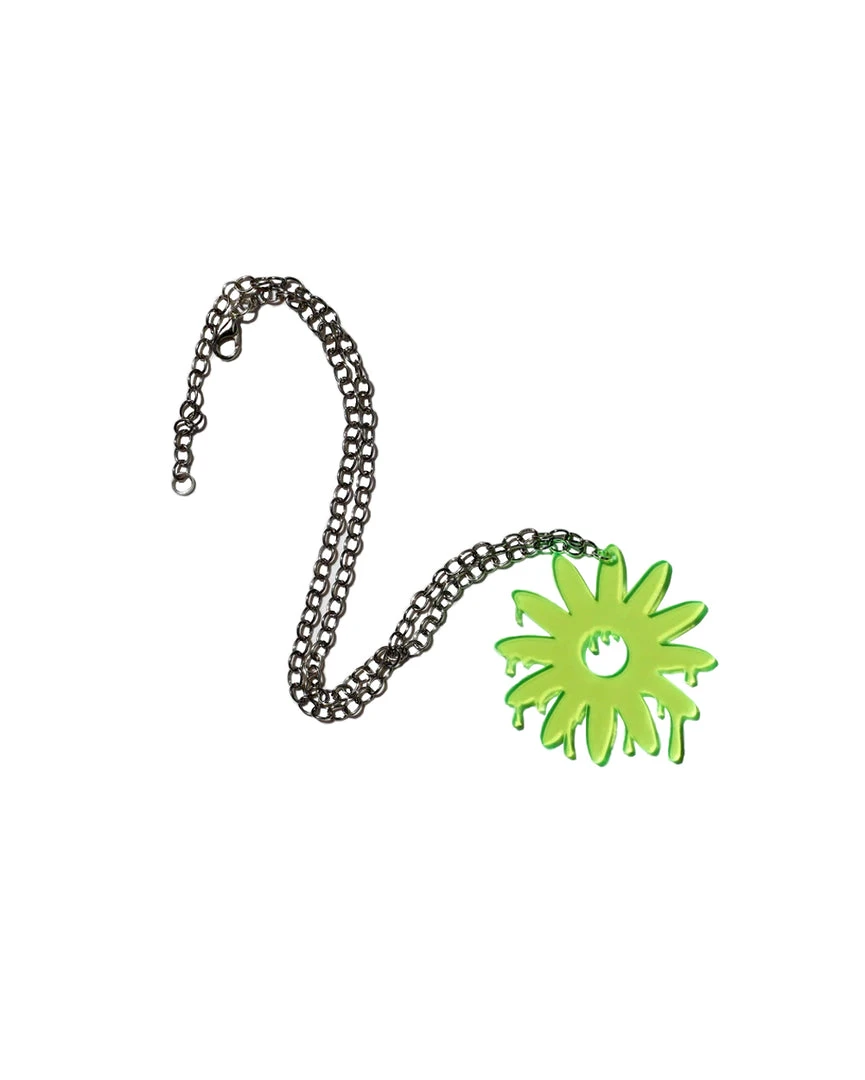 The One Stop Rave Daisy Drip Choker is all about the good vibes. This necklace has a black chain with an attached acrylic melting daisy charm that glows in the dark.