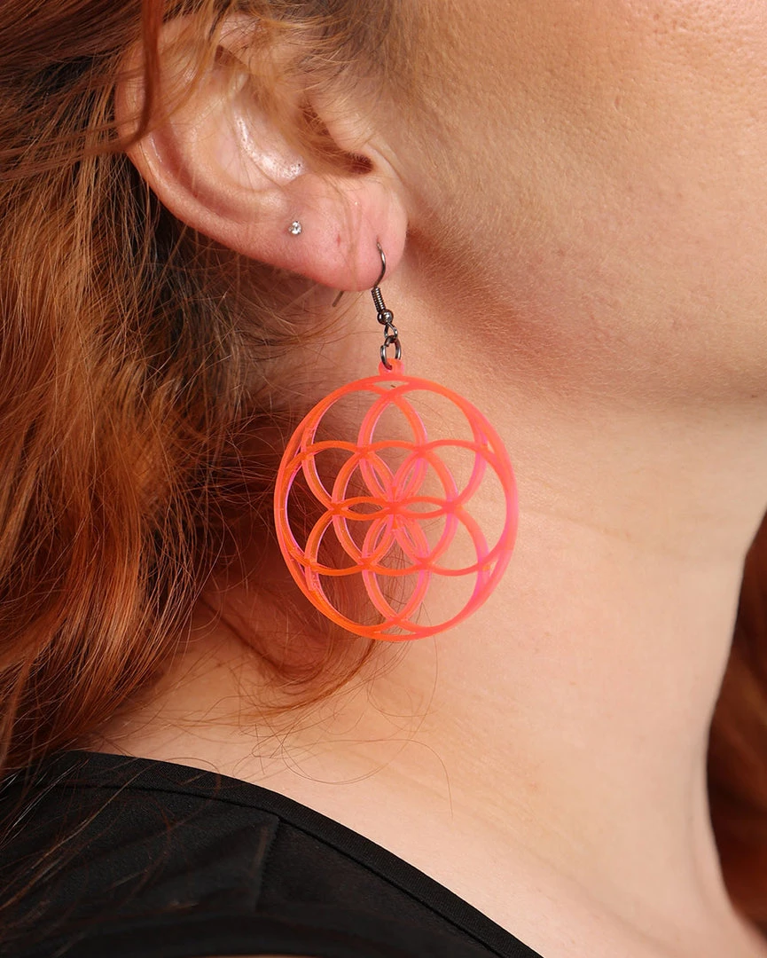 Glow under UV at ur next music festival with the One Stop Rave Seed of Life Earrings. These dangling earrings feature a mesmerizing pattern of the seed of life. They’re available in fun different colors: dark orange, orange, yellow, green, and blue.