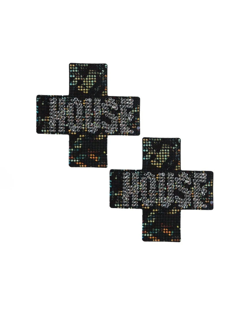 All the house hotties need our exclusive Pastease X iHR Rhinestone House Pasties! Get down & groovy in these funky black cross pasties feature a subtle rainbow shine and rhinestone HOUSE letters to let everyone know where ur heart lies.