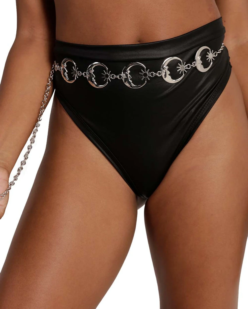 Bring them to another dimension with the Space Goddess Belly Chain. This delicate silver chain belt has intricate moon and star charms all over, perfect to wear high or low on the waist.