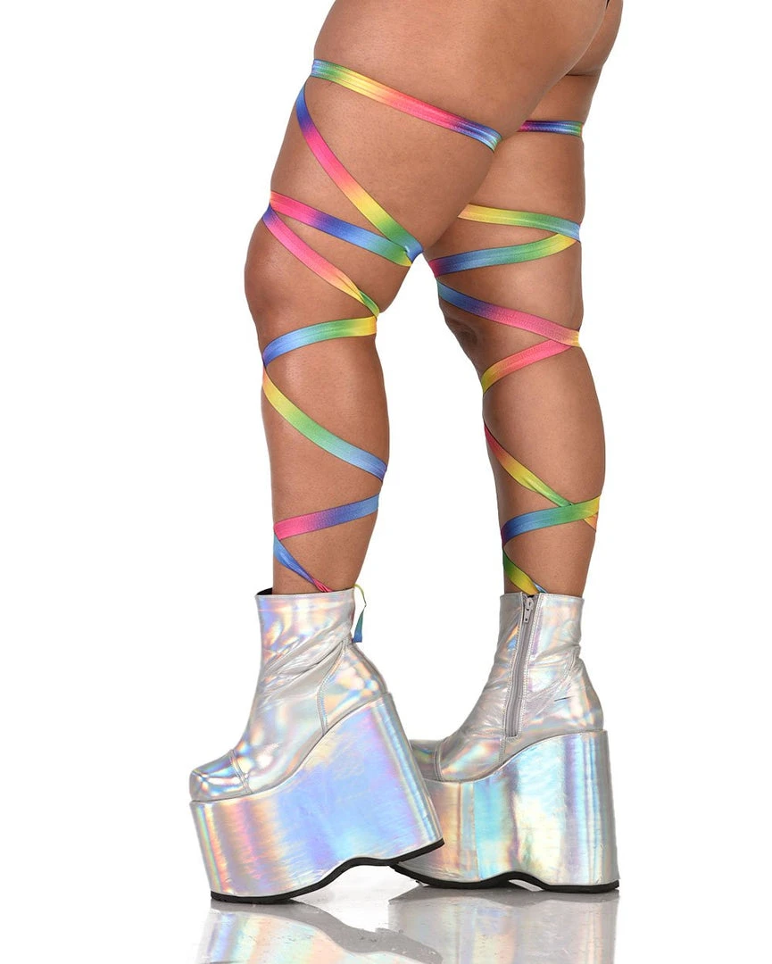 Our new Rainbow non-slip leg wraps are lined with a silicone lining inside to hug your thighs and stay up all night while you’re dancing away. These leg wraps are now sold in pairs! These leg wraps will add more texture, color, and character to your legs whether you are wearing fishnets, nylons, or fluffies.