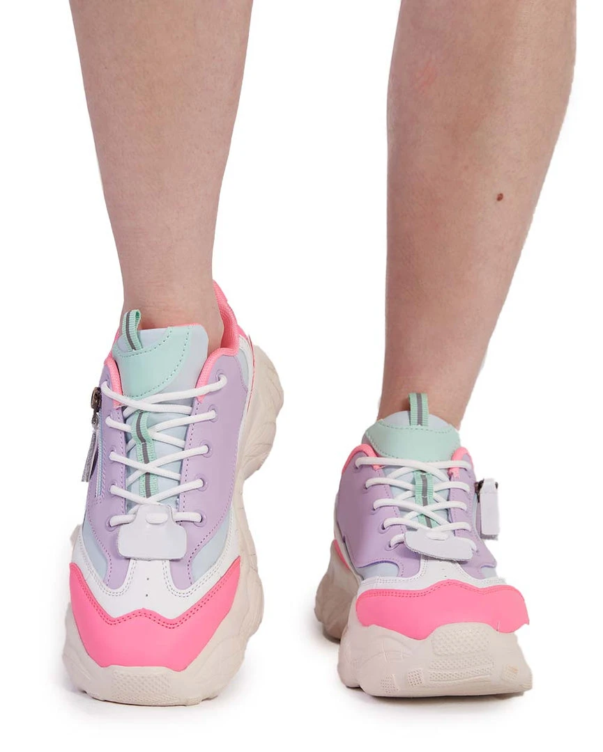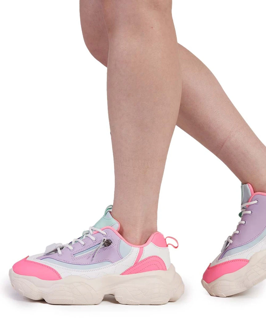 Unleash ur playful side so stylishly with the Blowin’ Bubbles Retro Chunky Sneakers. This pair combines cream and pastel shades that are accentuated by zipper detailing.