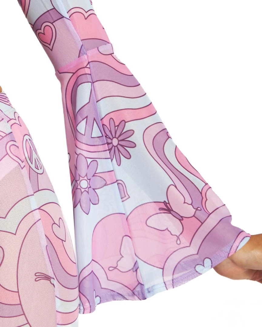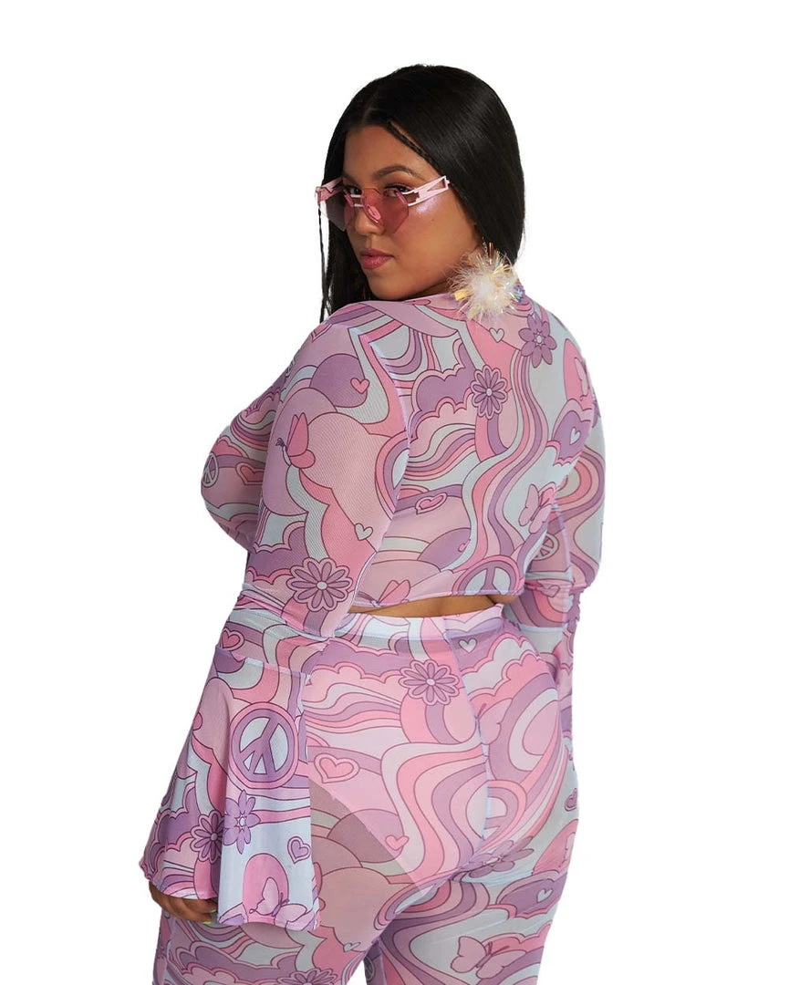 Throw up ur peace signs and get dancing with the Free Spirit Cutie Mesh Longsleeve Top. This top has a cropped cut, bell sleeves, and a front-tie design. Wear it with its matching bell bottoms for a cute rave look.