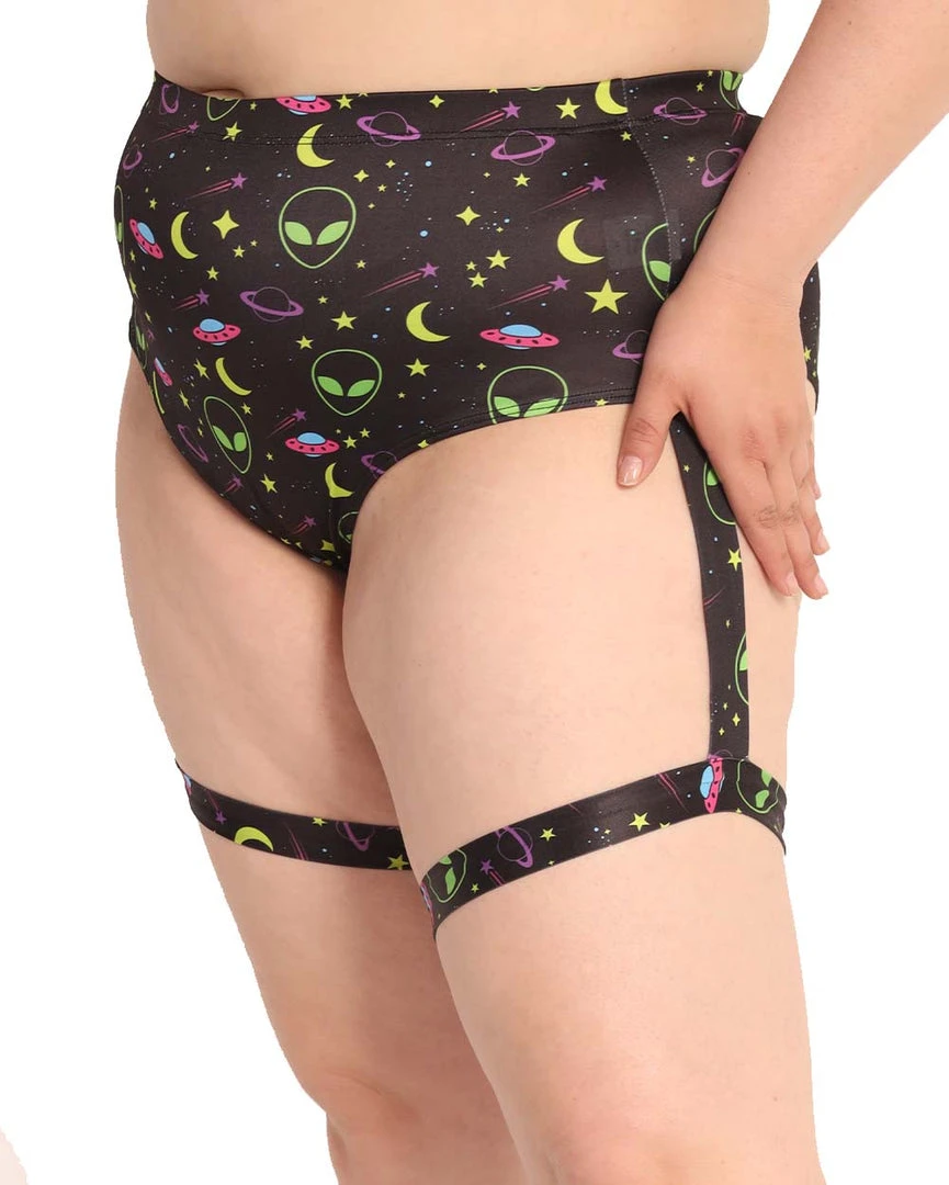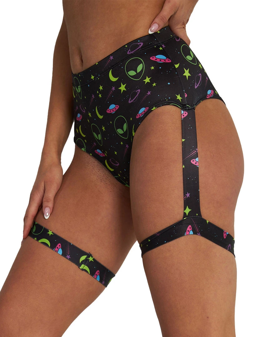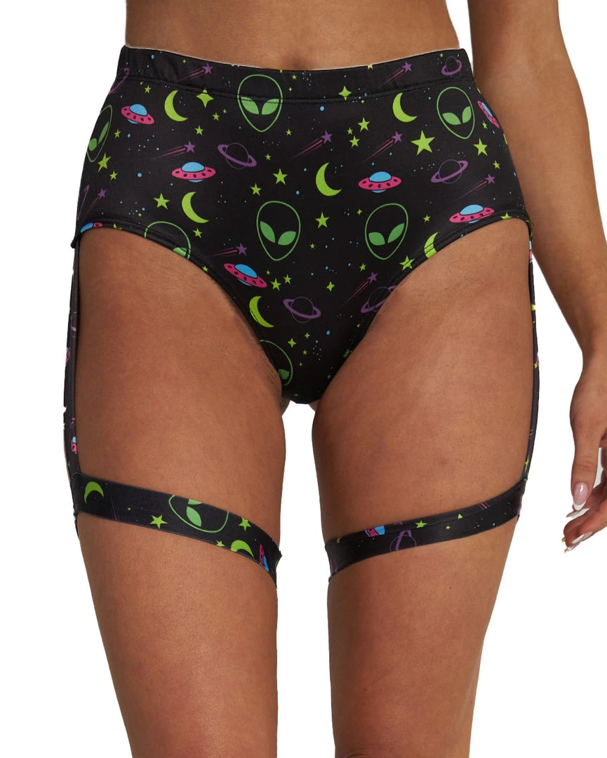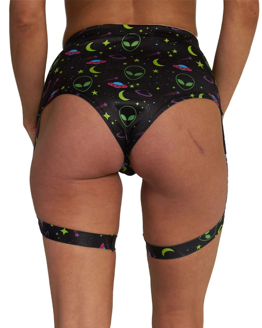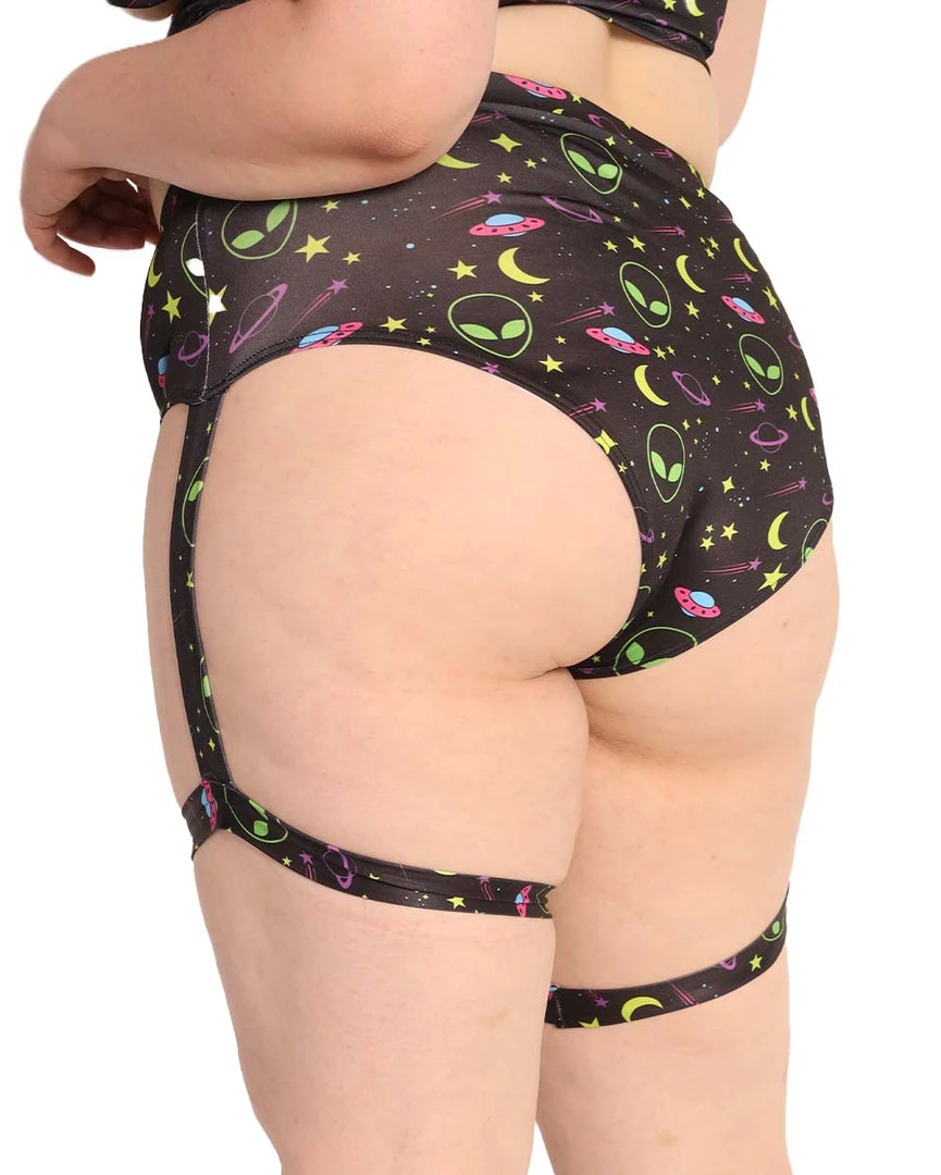 Wear the Space Frenzy Harness Bottoms because u rule all the planets. These high-waisted bottoms have cheeky coverage, attached leg harnesses, and a print that’s out-of-this-world.Â