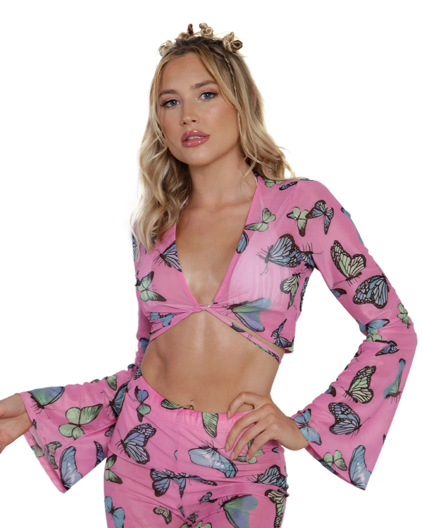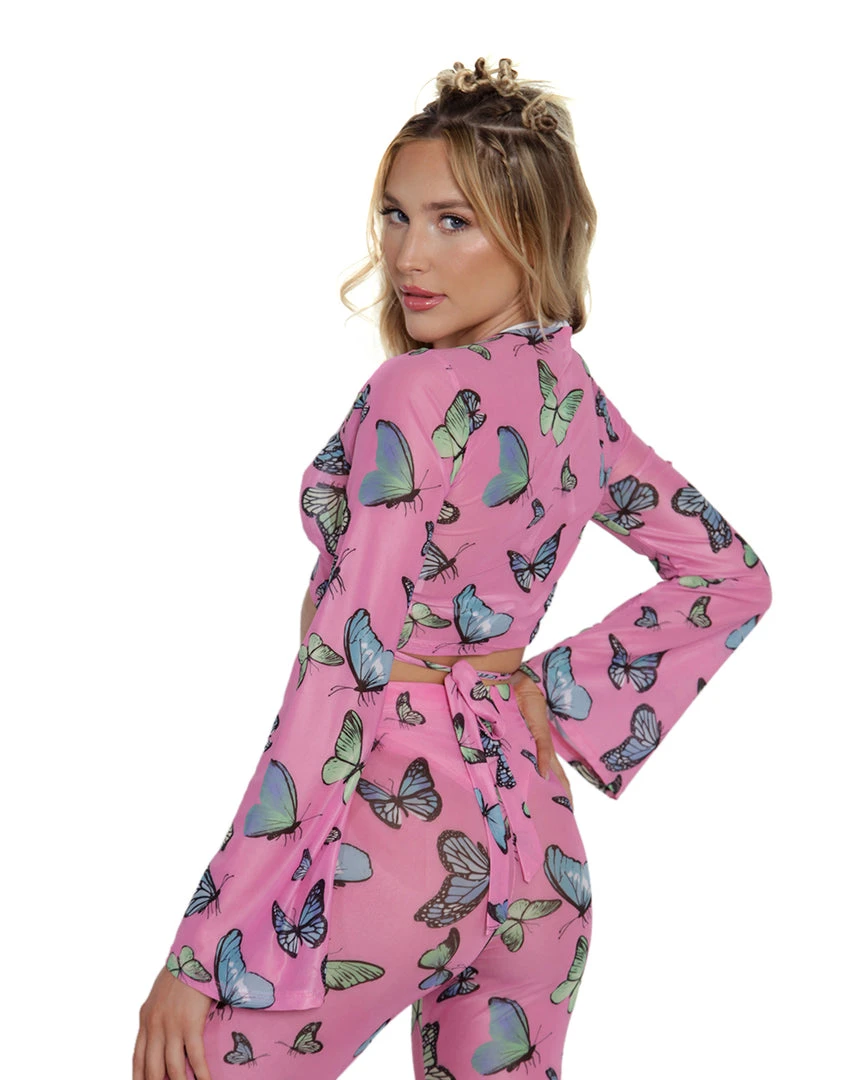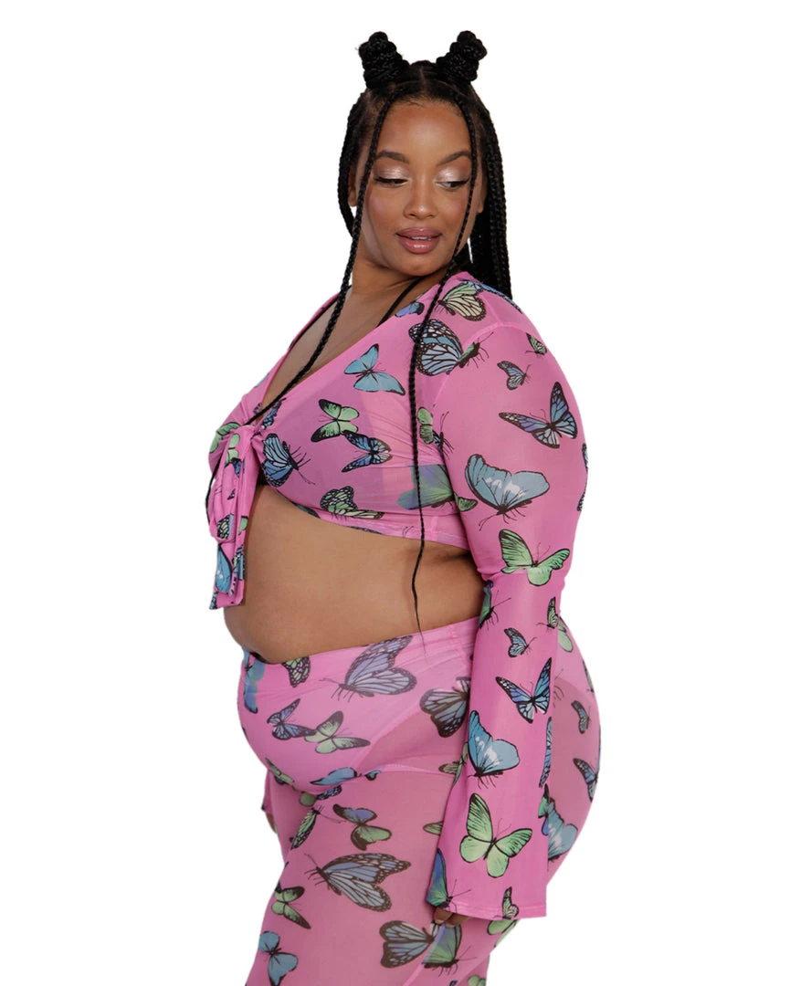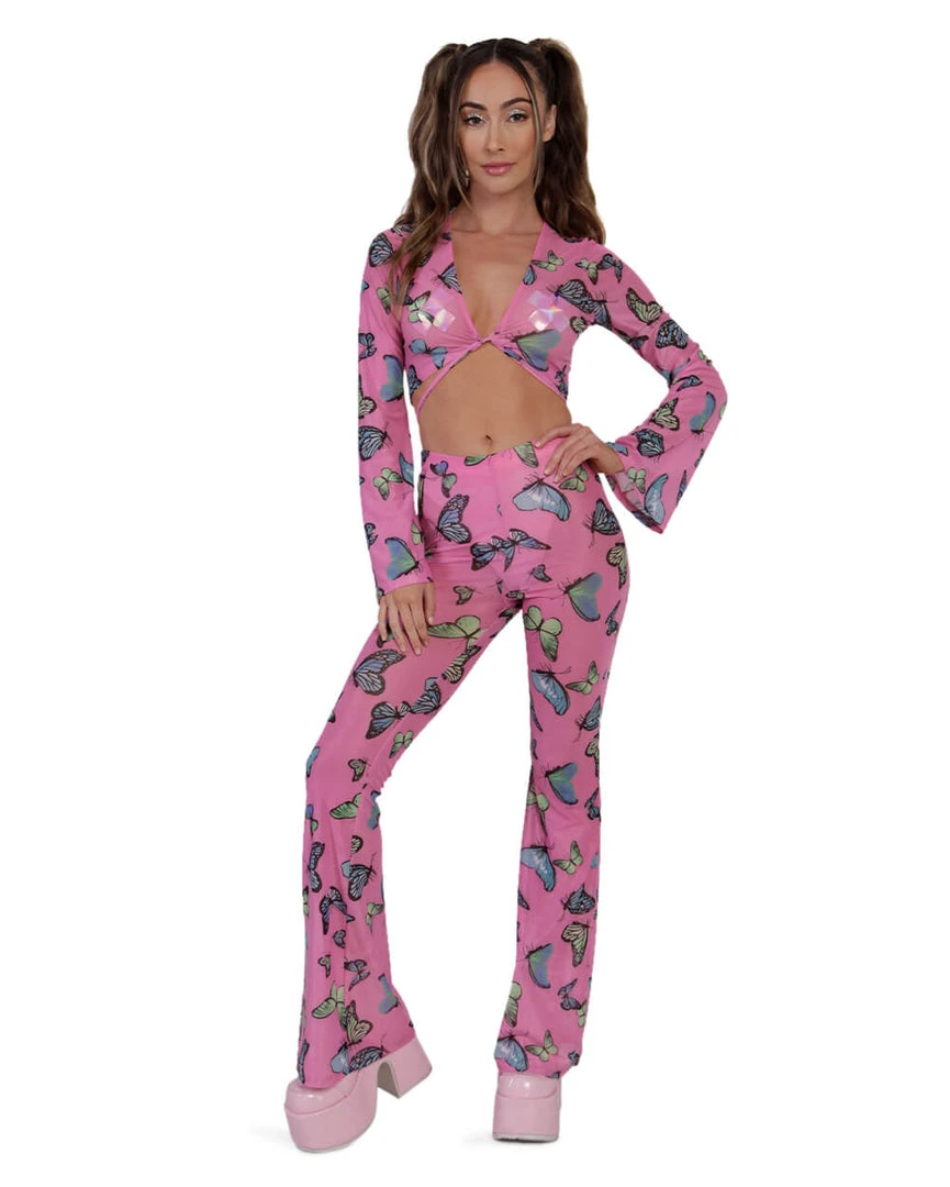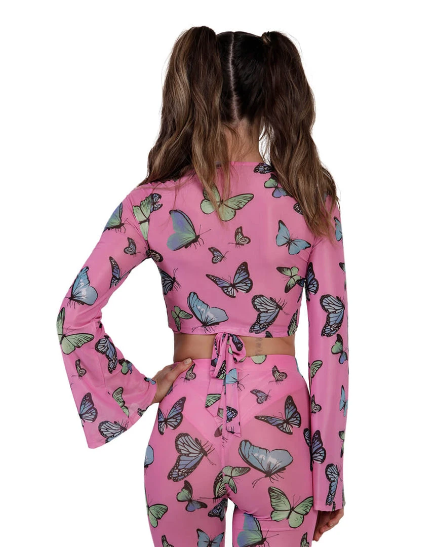 You’re fluttering around the disco dancefloor in our Butterfly Groove Mesh Front Tie Crop Top. This flirty pink top has a front-tie detail and a colorful butterfly fabric. It looks amazing when paired with its matching pants or bikini bottoms.