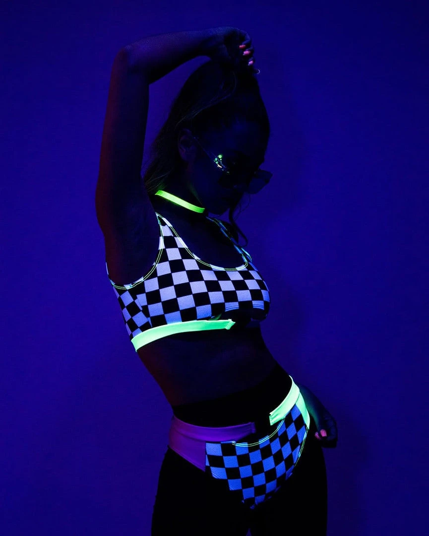 You’ll be coming in first place in our Vroom Vroom Checker High Waisted Shorts. These stylish rave bottoms have a trendy checkered pattern and accented with neon purple and green connected with a dope black buckle.