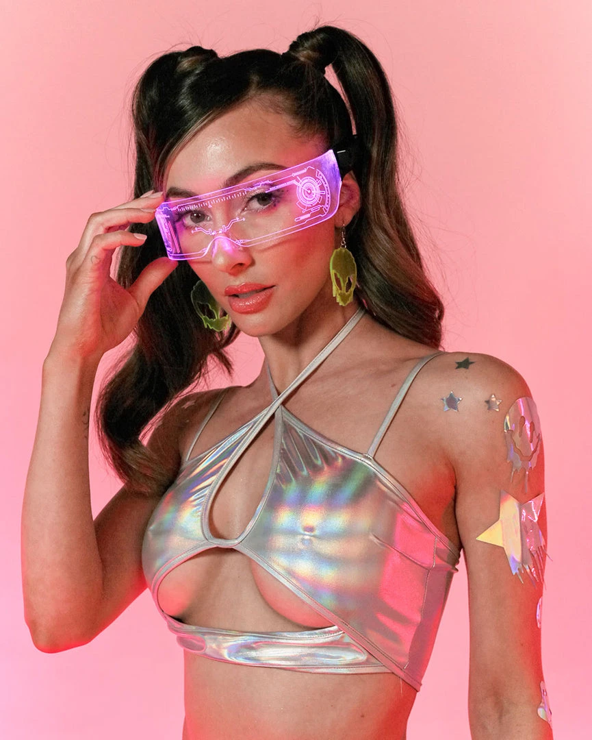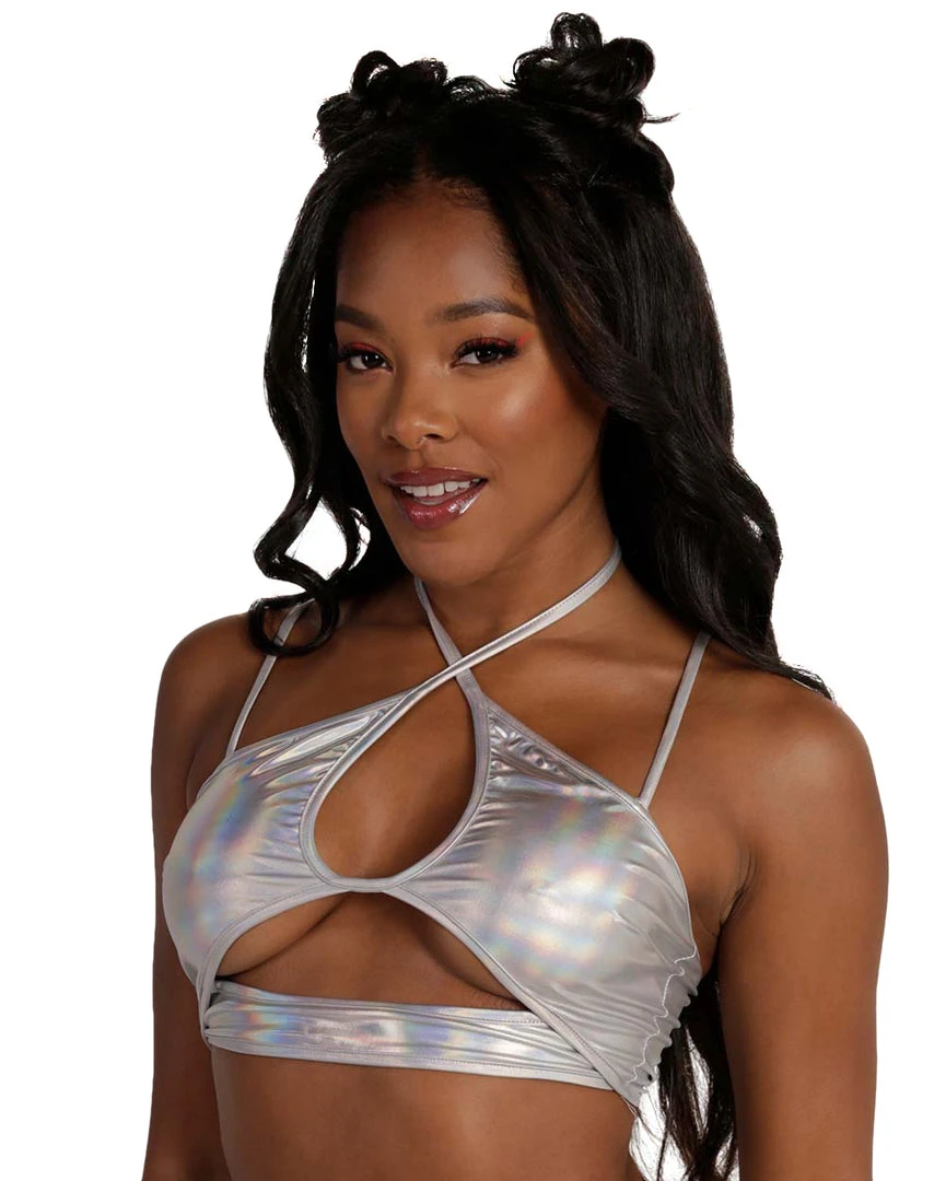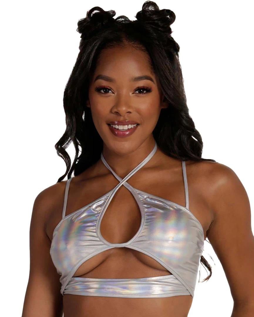 Shimmer and shine wherever u go with our Iridescent For Days Halter Top. It features a unique design, with its underboob cut-out, double straps. and keyhole accent in the center.