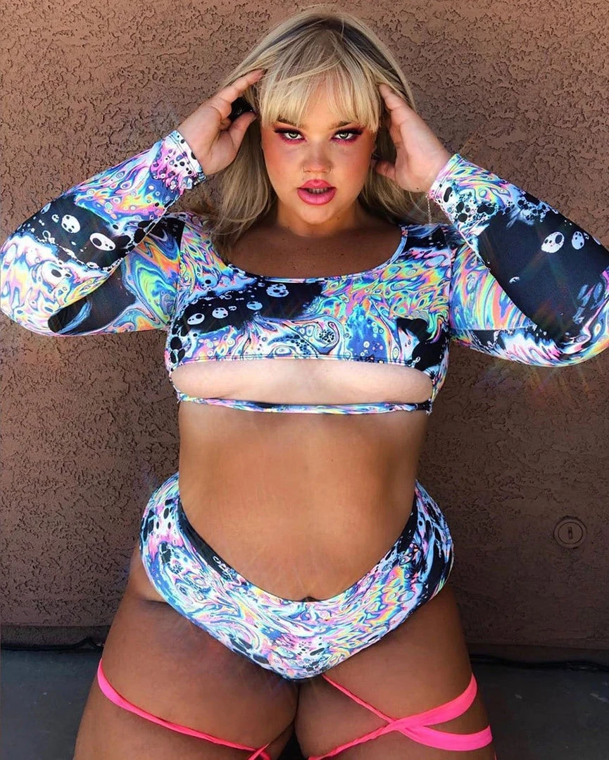 You’ll never dull ya fabulousness in our Liquid Tripp Underboob Long Sleeve. This multi-colored psychedelic print rave top has a square neckline with form-fitted long sleeves and a tasteful underboob cut out.