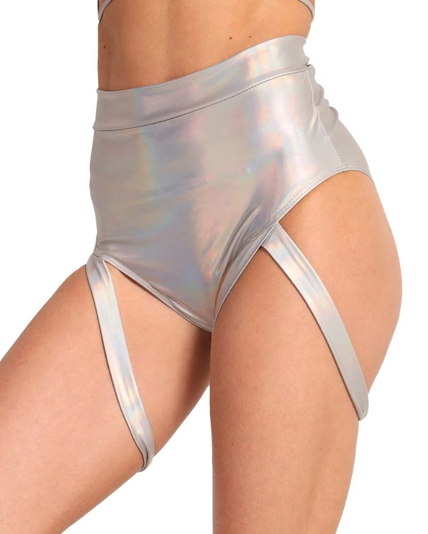 Wear our Holo Badd Girl High Waisted Harness Booty Shorts because you’re the main character. These bottoms have a high-waisted cut, body-hugging silhouette, holographic construction, and attached leg straps.