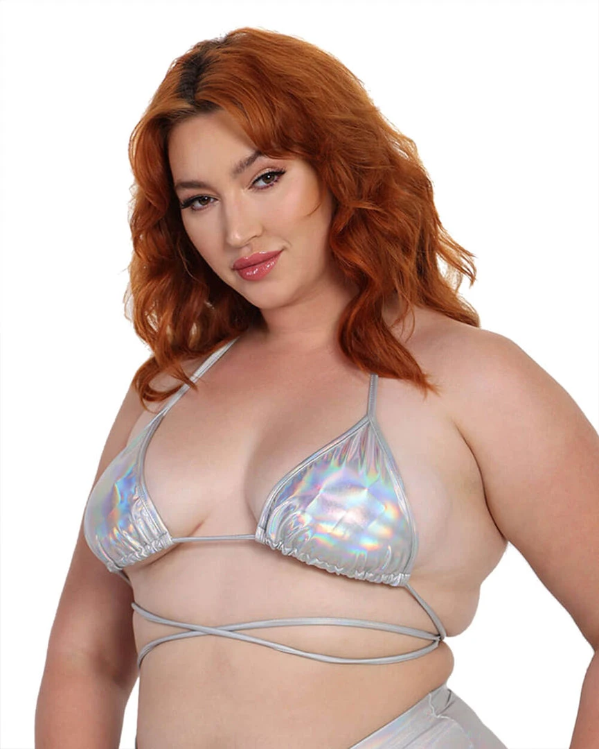Take it to the moon with our Space Date Holo Wrap Around Bikini Top. This silver holographic triangle top features extra long strings for endless ways to tie. Add some shine to ur favorite rave fit with this piece!