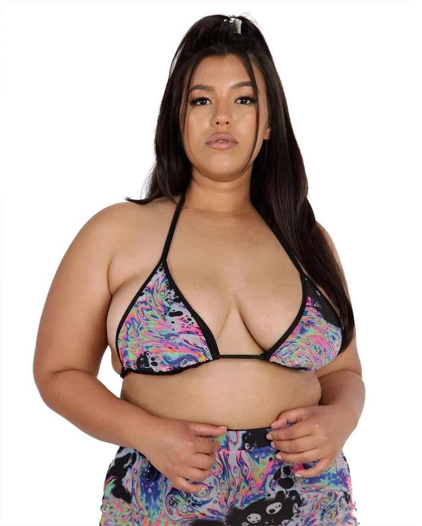 It’s a psychedelic adventure in our Liquid Tripp Mesh Wrap Around Bikini Top. You take it there every time in this triangle top that features a psychedelic & colorful printed fabric and adjustable neck & back tie closure.