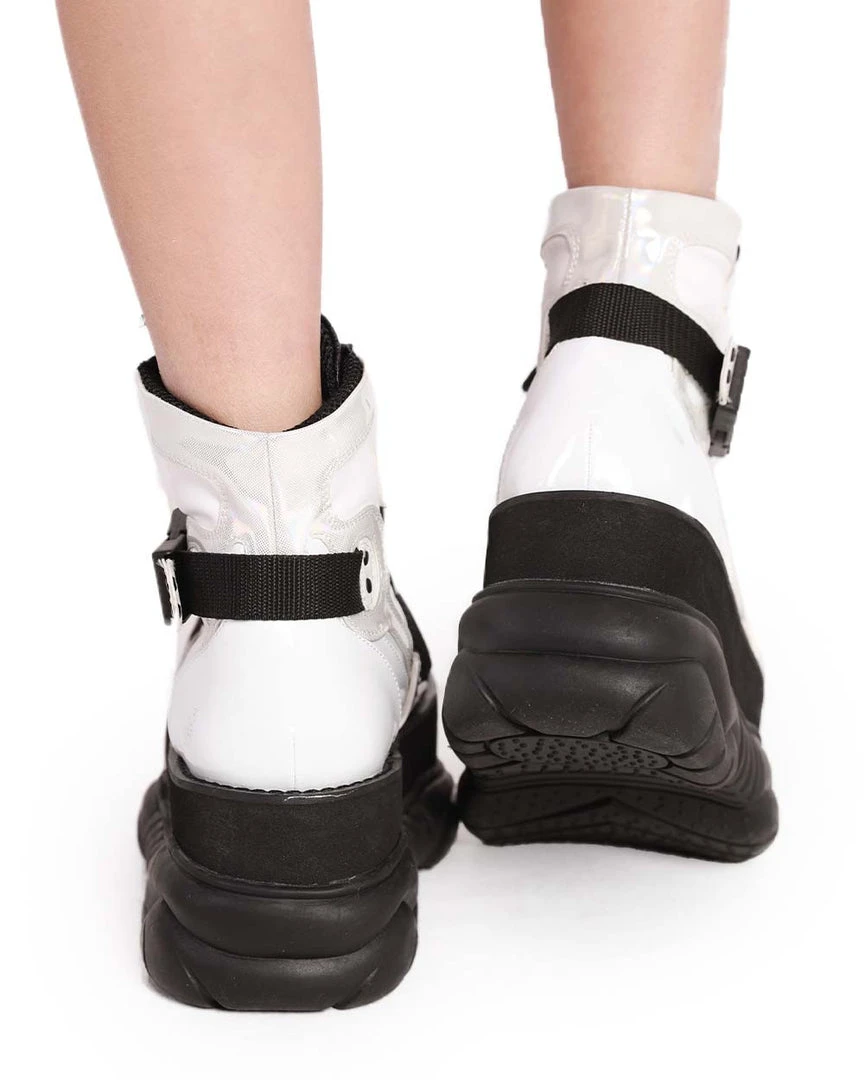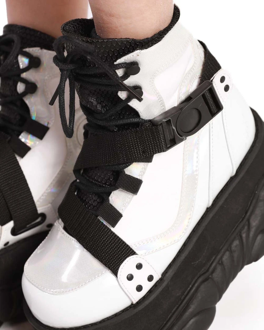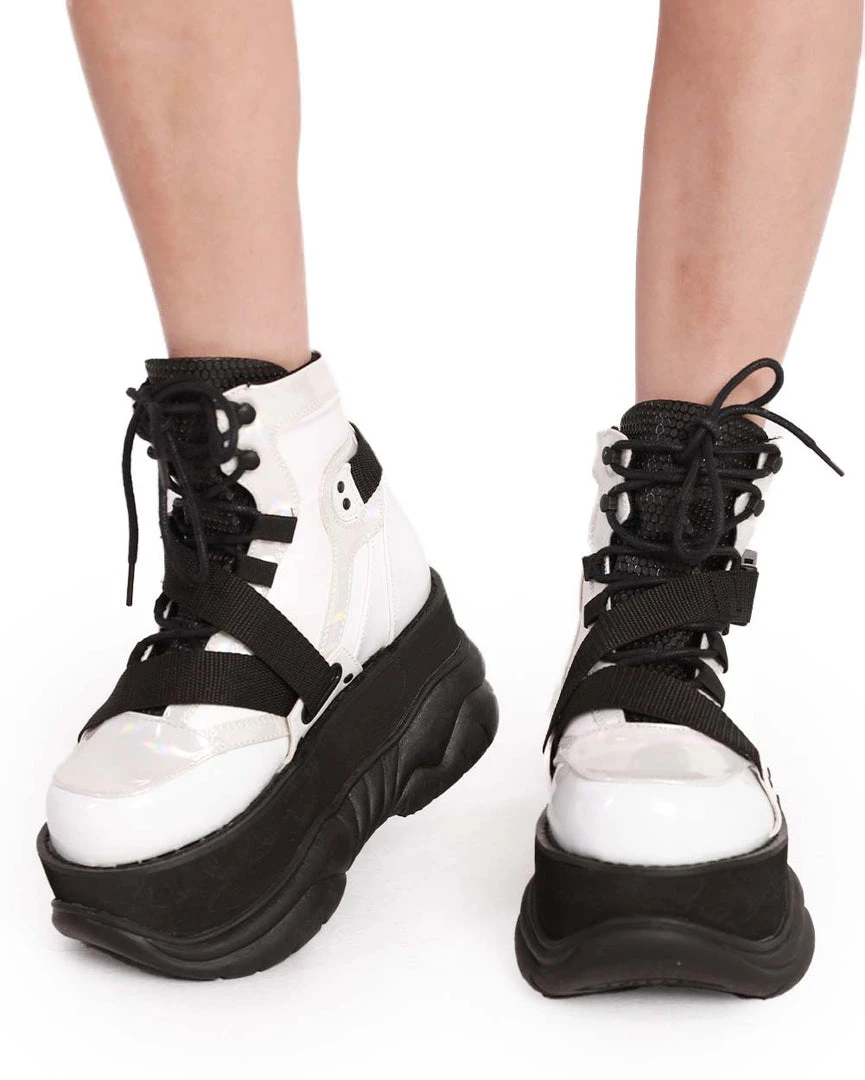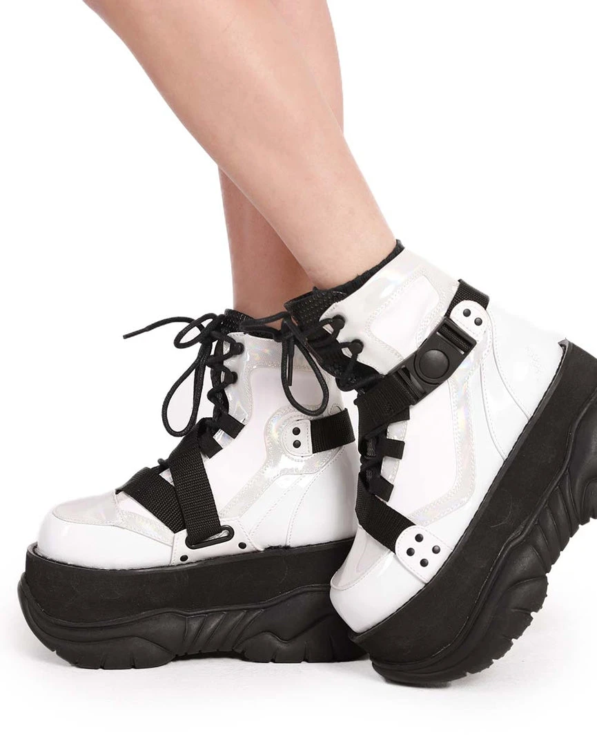 Reflect rainbows as u walk with the Demonia Extraterrestrial Booties. These white holographic platform boots feature holographic and buckle accents and lace-up closure.
