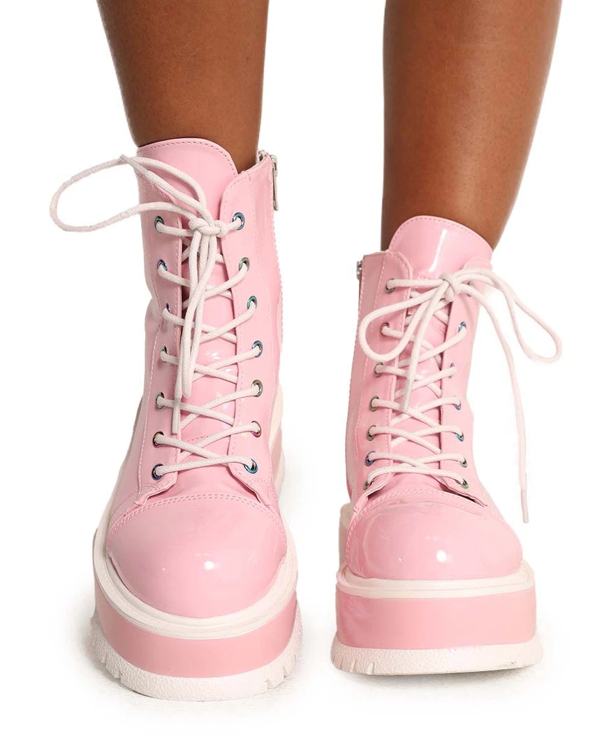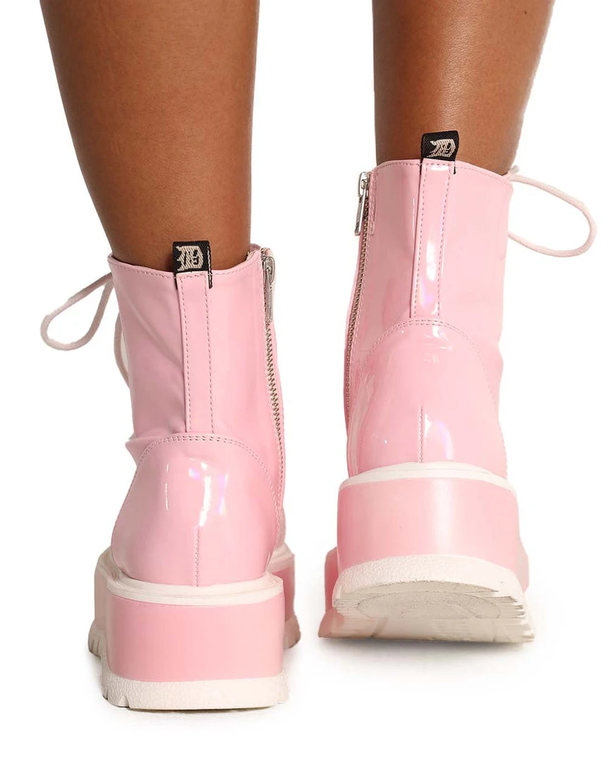 Wear our Demonia Life in Pink Holo Lace-Up Platform Boots ’cause you’re pretty in pink. These boots have a baby pink vinyl construction, chunky platform heels, and lace-up closure.