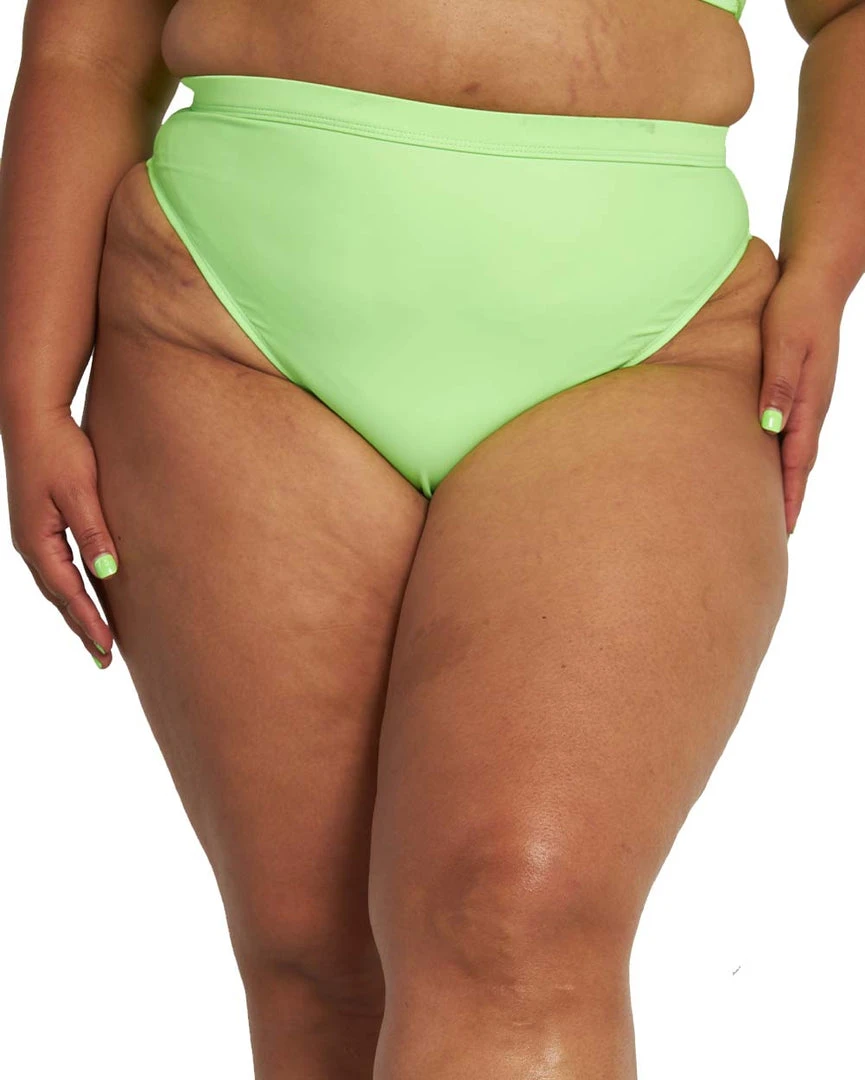 Get lost under the festival lights with our Recycled Fabric Headbanger Hi-Waist Bottoms. These traffic-stopping neon green bottoms have a high-waisted cut, a cheeky coverage, and a print that says HEADBANGER because u mean business riding those rails.