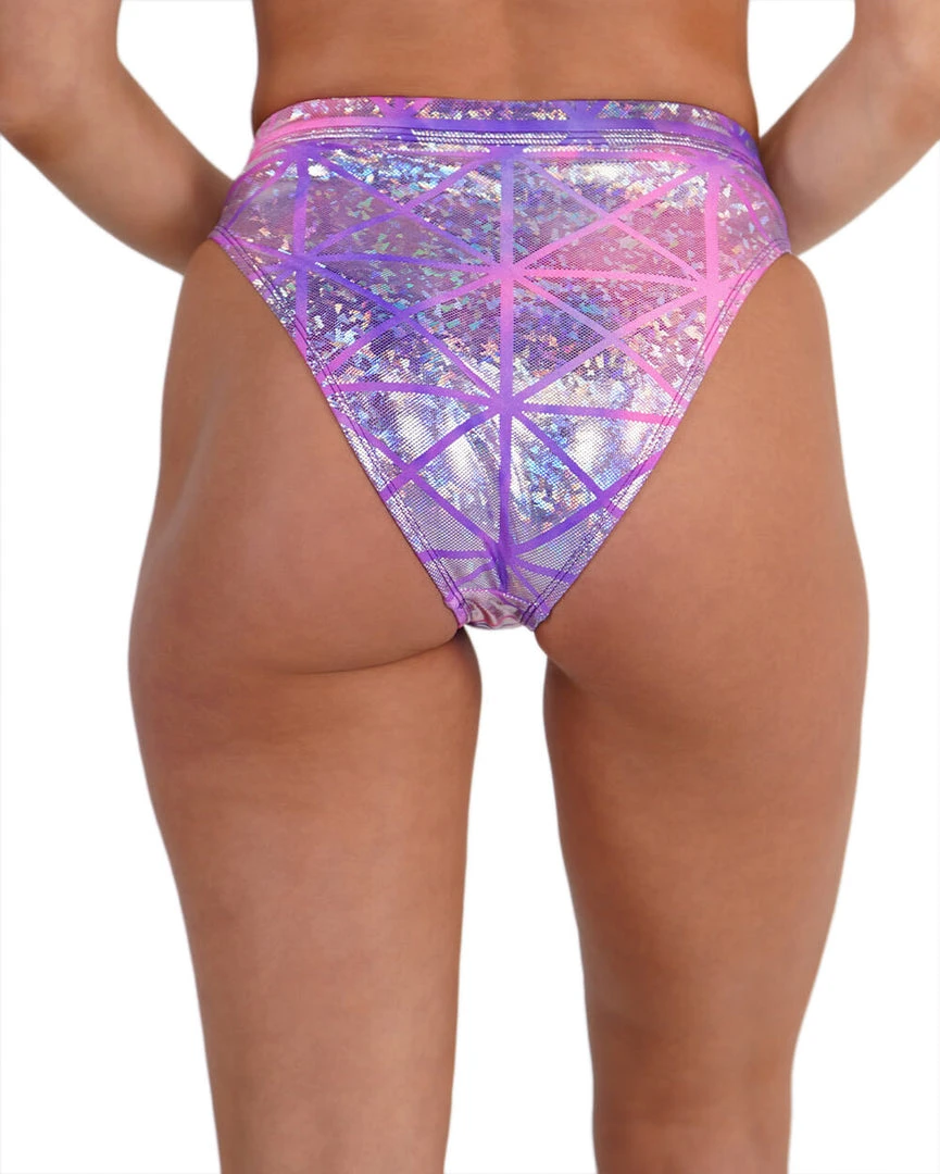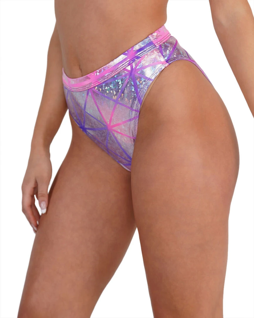 Rock our Holo Cotton Kandi High Waisted Bottoms cause you love to sparkle. These radiant pink & purple rave bottoms feature a holographic fabric, high waisted, and moderately cheeky fit.