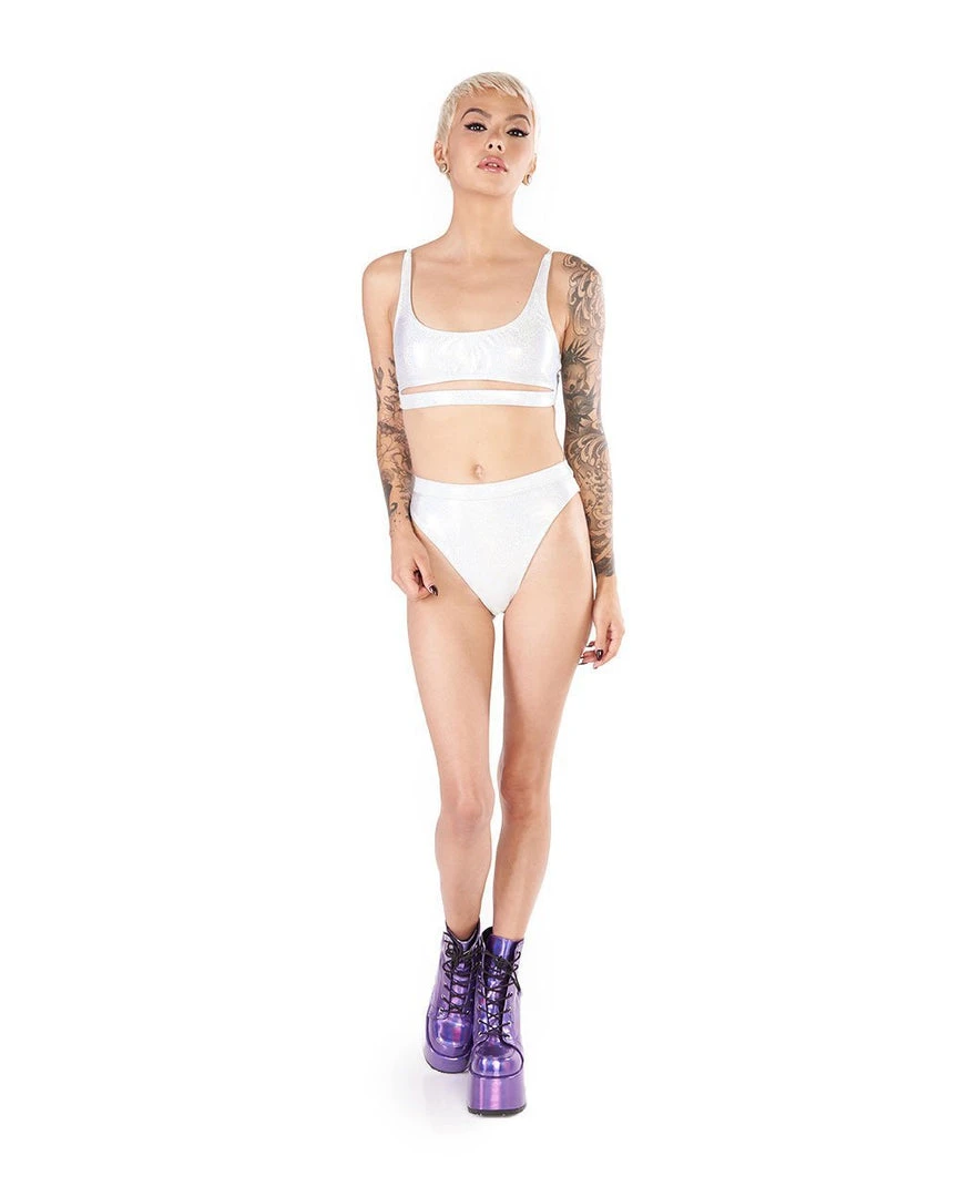 Our Holographic Cali High Cut Bottoms are going to be your new favorite rave piece. These stunning iridescent bottoms are high waisted, ultra cheeky, stretchy, and sparkle like no other. What more could you ask for?