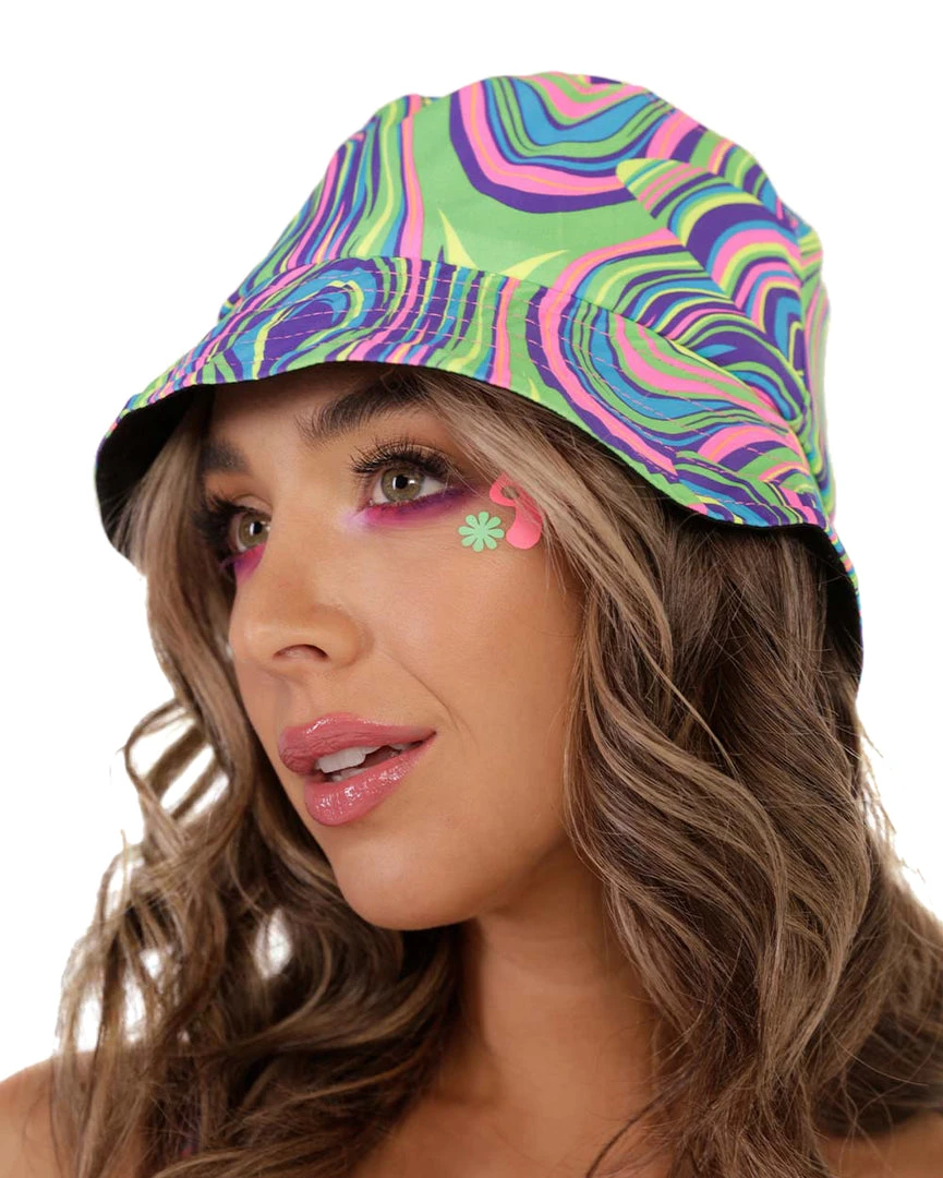 Get down and groovy in our Sooo Trippy Bucket Hat. It’ll add a vibrant element to ur print, thanks to its multicolored wavy print that illuminates under the festival lights.ย