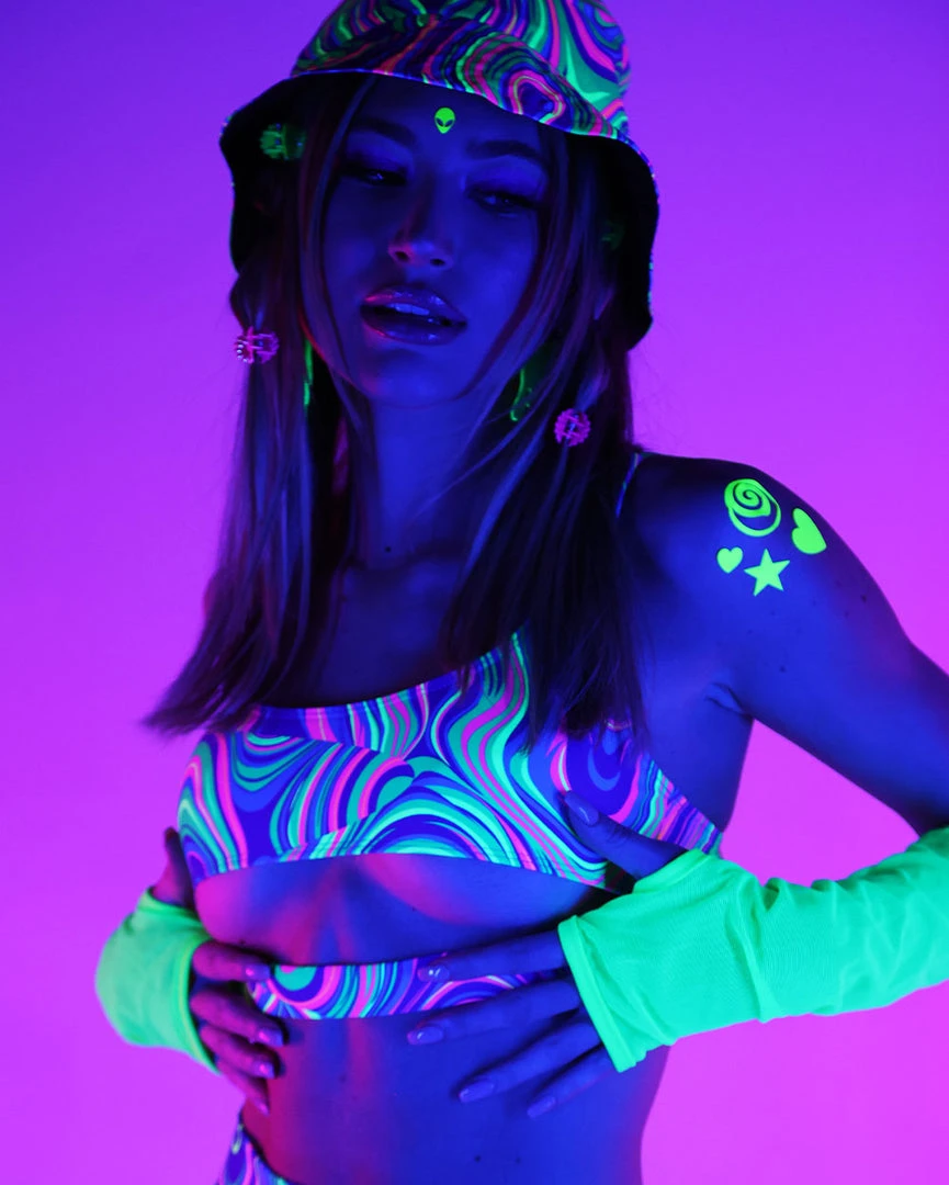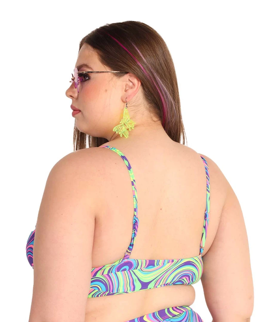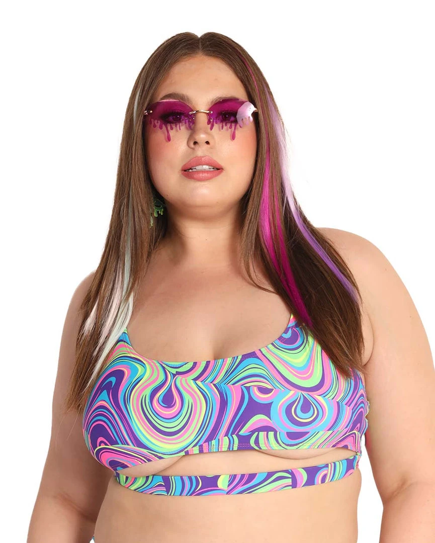 Get down and groovy in our Sooo Trippy Underboob Cutout Top. It features a square neckline, underboob cutout, and a vibrant, multicolored wavy print that illuminates under the festival lights.ย