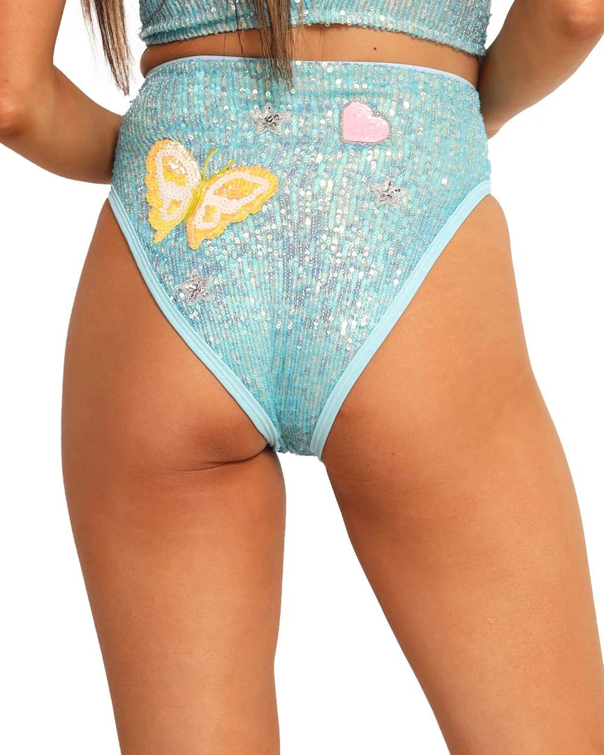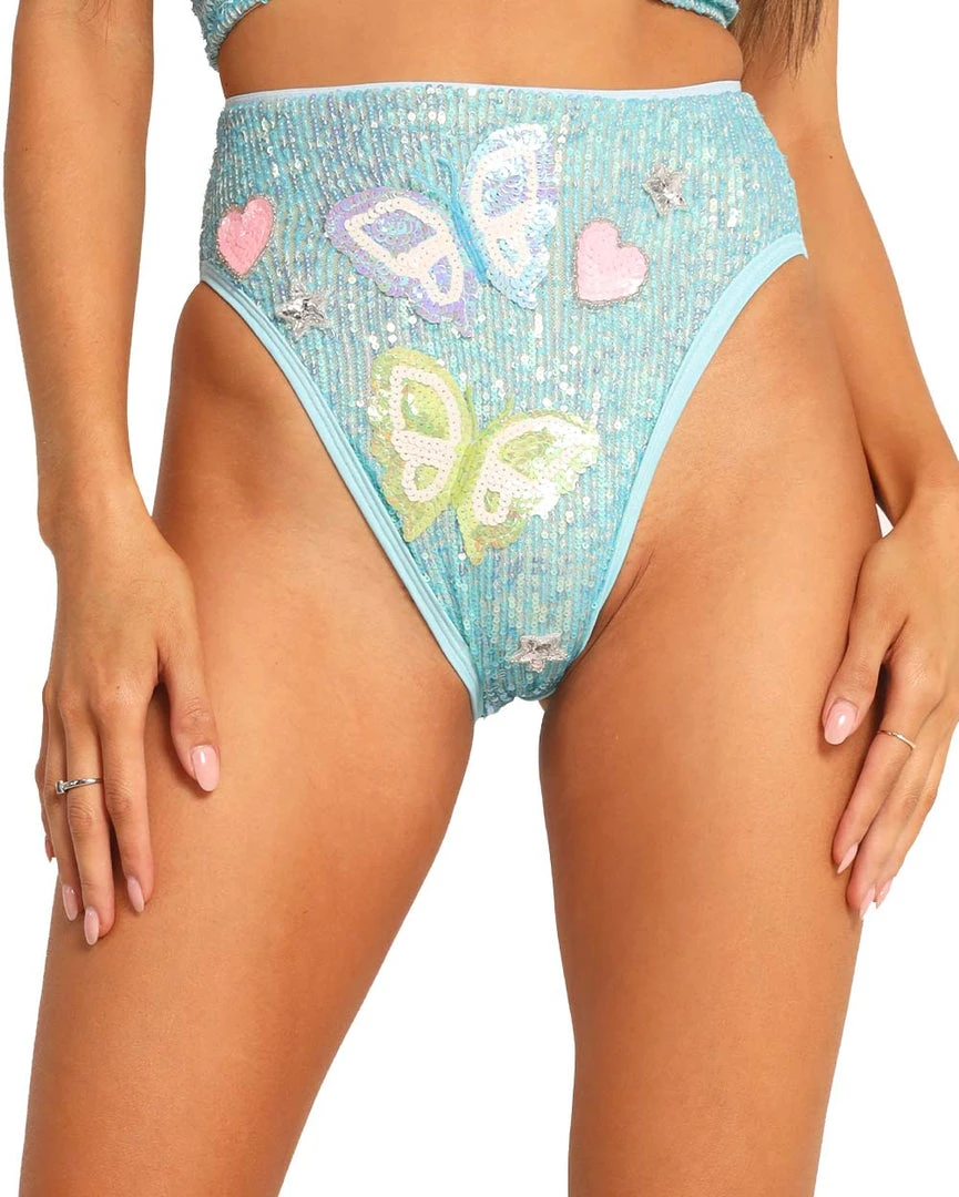 Our EastnWest Label Believe in Fairies Butterfly Sequin Bottoms are everything u need to keep frolicking around the festival grounds all day. It has a high-waist cut, mesh construction, and butterflies, hearts, and stars made from sequins.Â