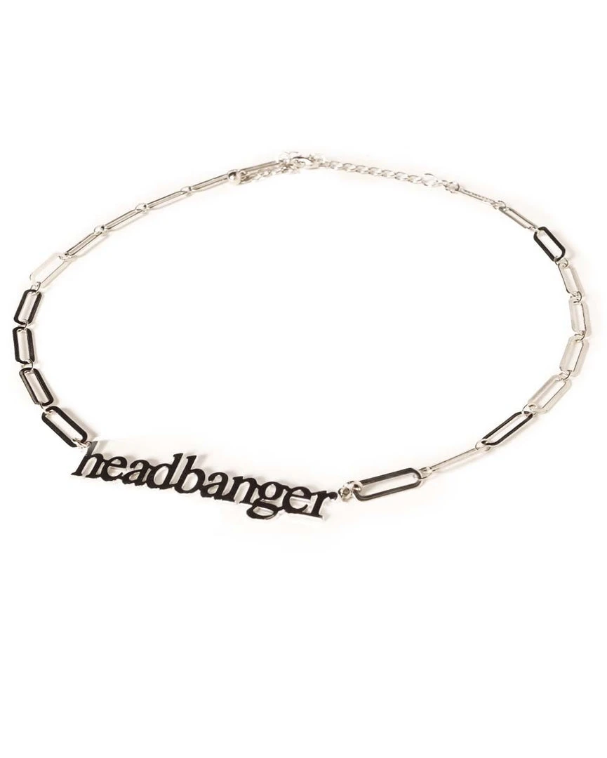 Represent the face-melting bass fam with the Headbanger Chain Choker. This choker has a silver-plated chain and pendant that spells out “headbanger.”