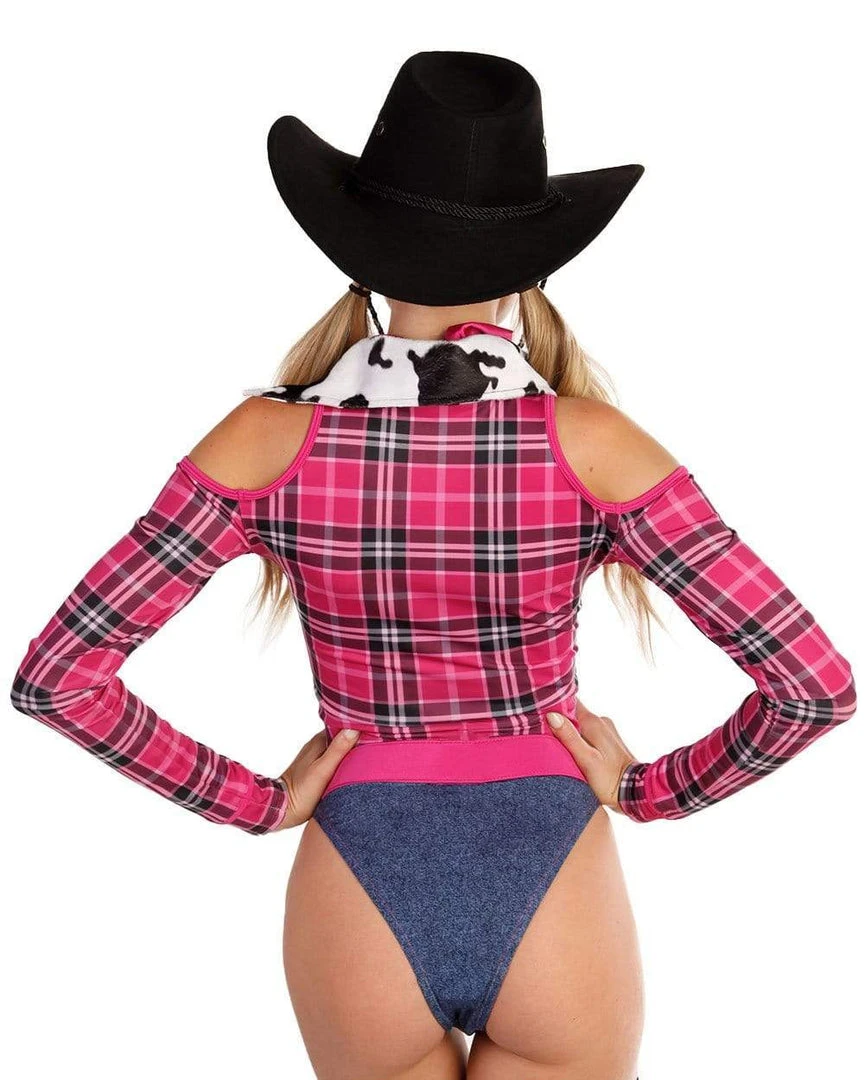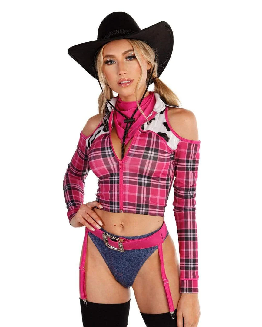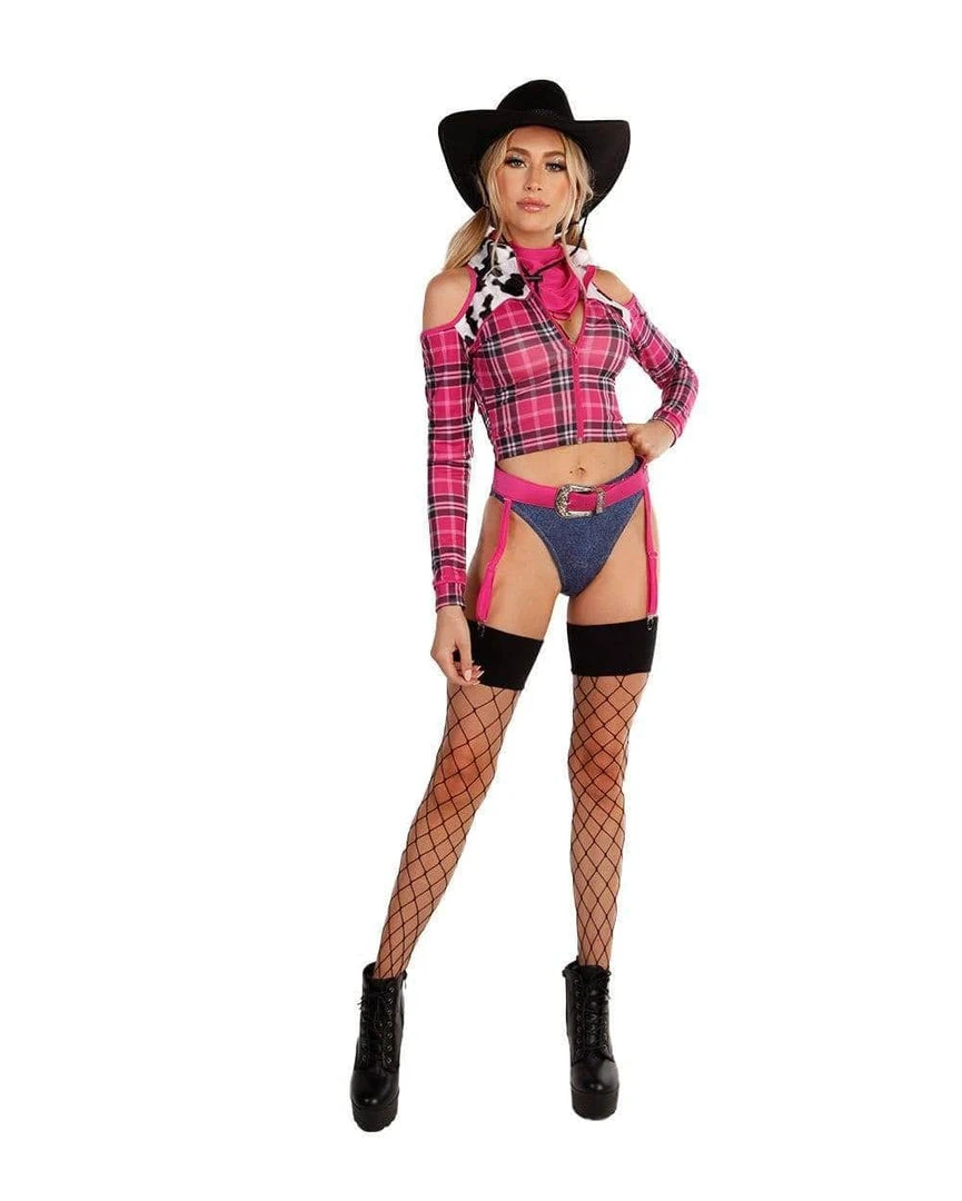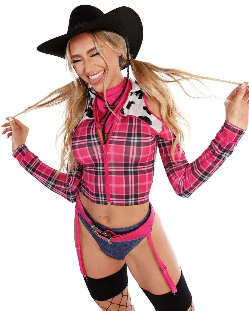 Youโre on some yeehaw vibes in our iHeartRaves Exclusive Ride ‘Em Cowgirl Costume. This exclusive pink cowgirl costume will have everyone giddy when they see you. This western style look includes a sexy pink plaid crop top with a cow print collar and denim patterned booty shorts. Accessorized with a black cowboy hat, a stylish bandana, and one of a kind western buckle garter belt.ย