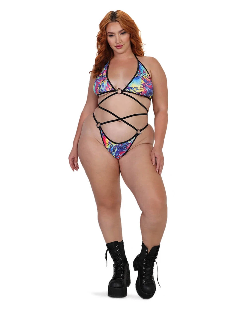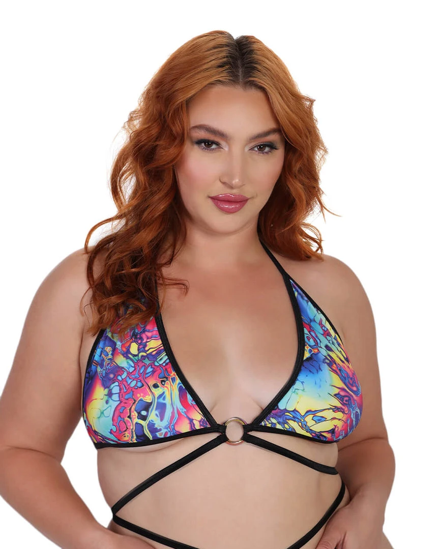 U are the exact embodiment of a psychedelic adventure with the HoneiiBeth Liquid Acid Triangle Top. This triangle top features a trippy UV-reactive print, a halter neckline, and strappy detailing that looks fabulous AF when paired with its matching bottoms.Â