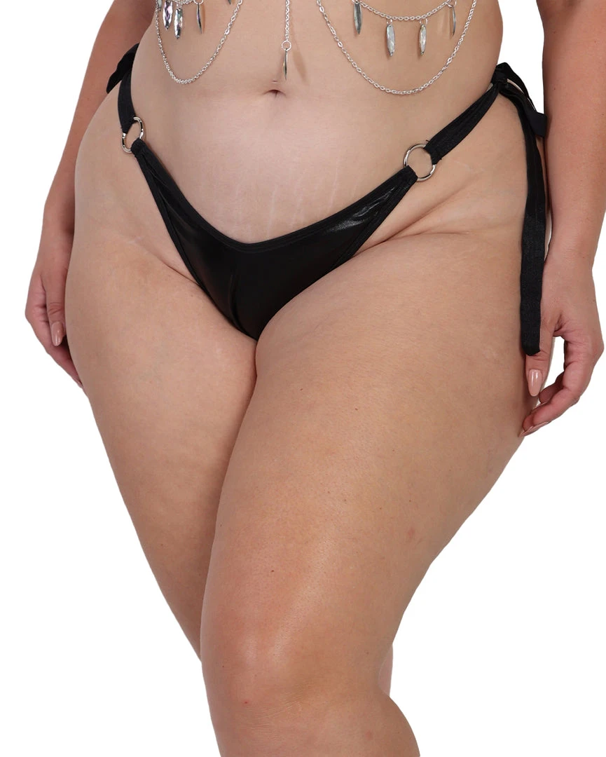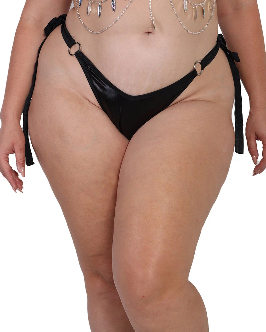 Be ready to look like a star with the HoneiiBeth x iHeartRaves Winnie Cheeky Bottoms. These bottoms have a glossy finish and are accented with o-ring and side-tie detailing.