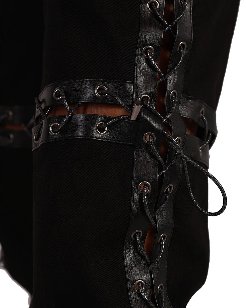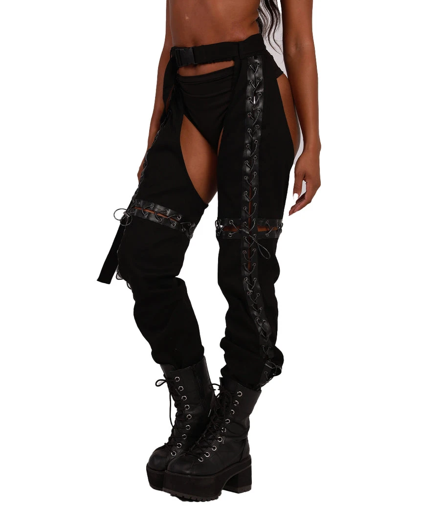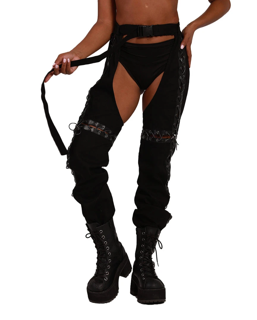 Stay comfortable while looking edgy and cool AF with the I’m Unorthodox Cross Stitched Chaps. These black bottoms feature a ripped design on the sides with zigzag stitching.