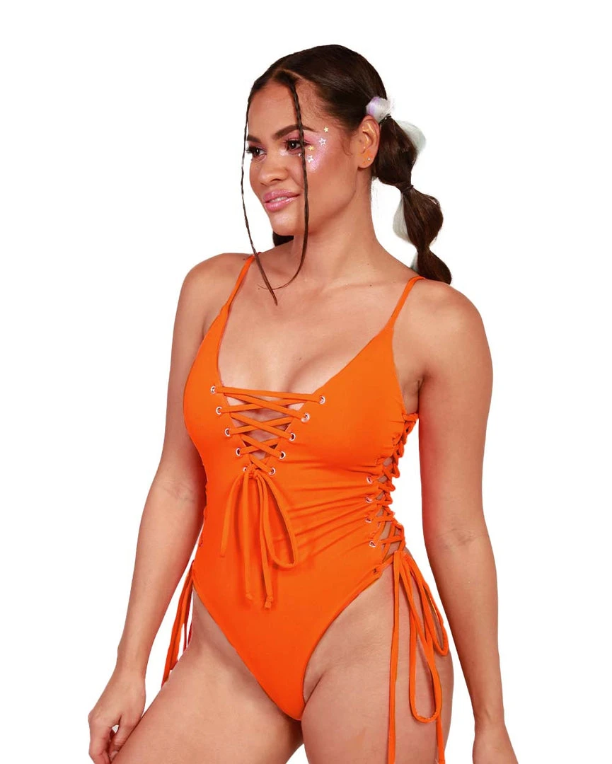 Nobody would be able to handle u in our Saucy Spectacular Playsuit. This one-piece comes in black and neon orange and features criss-cross accents all over, an open-back design, and cheeky coverage.Â