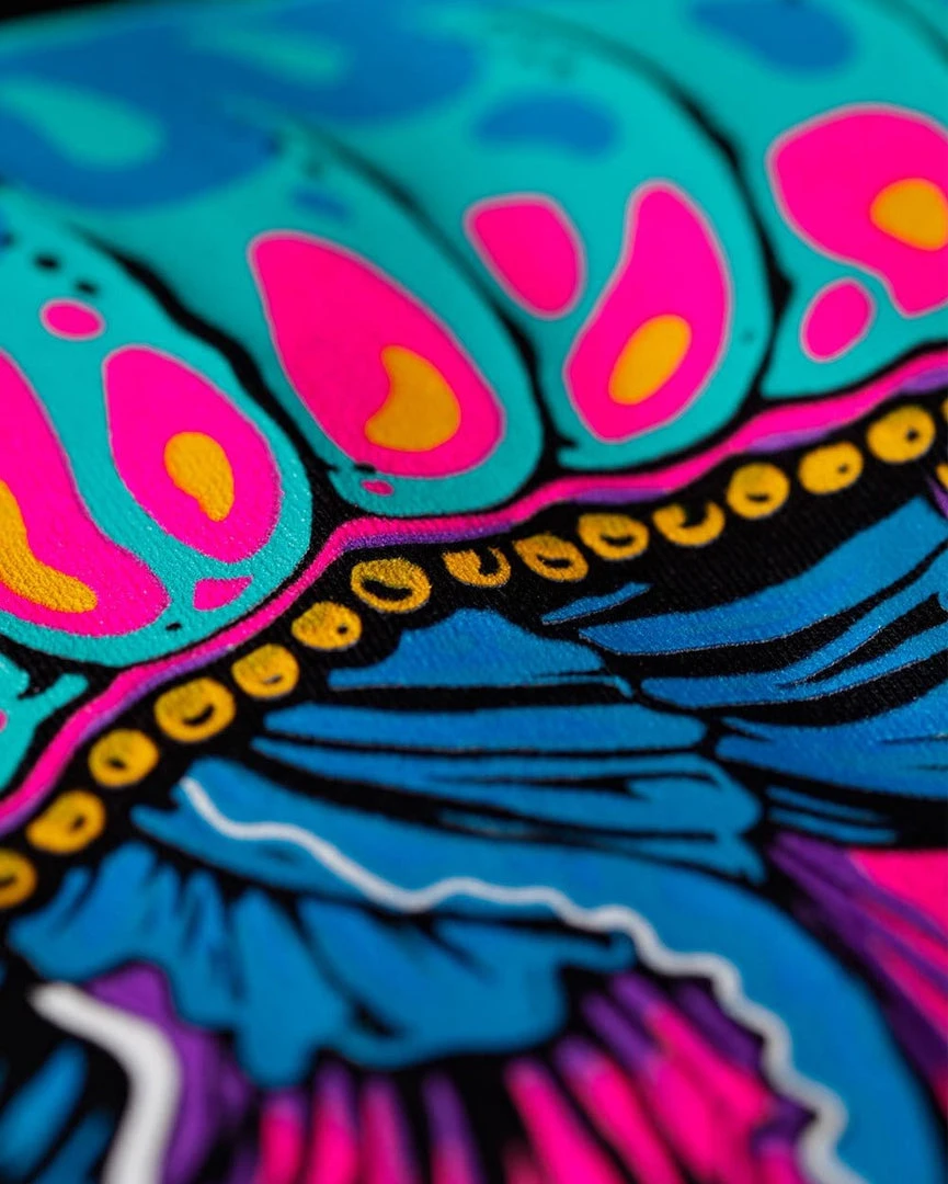 Billowing through the ocean, the translucent jellyfish shows off it’s bright blue, purple, and yellow. We’ll let you in on a little secret. The colors come from tiny pigment-changing organisms that have come along for the ride. A simpatico relationship illustrated with our original Luminance design on a premium ultra-soft men’s black t-shirt.