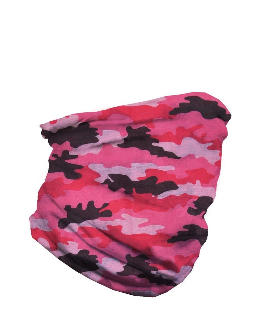 The Pink Camo Seamless Mask Bandana is a multi-functional face-covering that slides easily over your head to cover your neck, mouth, and nose. It can also be worn as a headband, wristband, hair tie, and more!