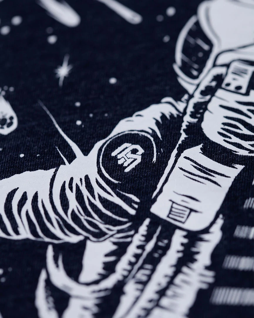 Our galactic explorer is caught in the storm. Raining down a torrent of asteroids, the heavens show no favorites. He must find his way to safety on our original Star Fire design on a navy tee. This premium poly-cotton blend gives you the best of both worlds: a buttery soft blank that is breathable doesn’t shrink and lasts longer than 100% cotton tees.