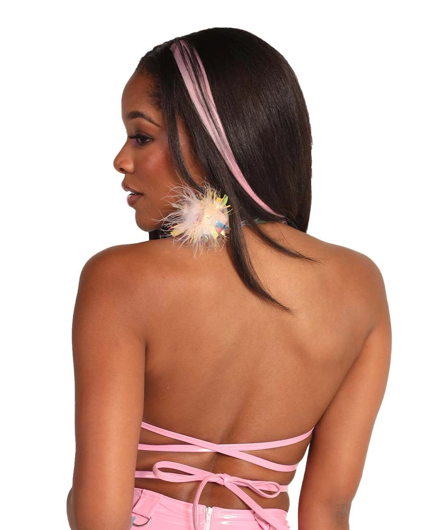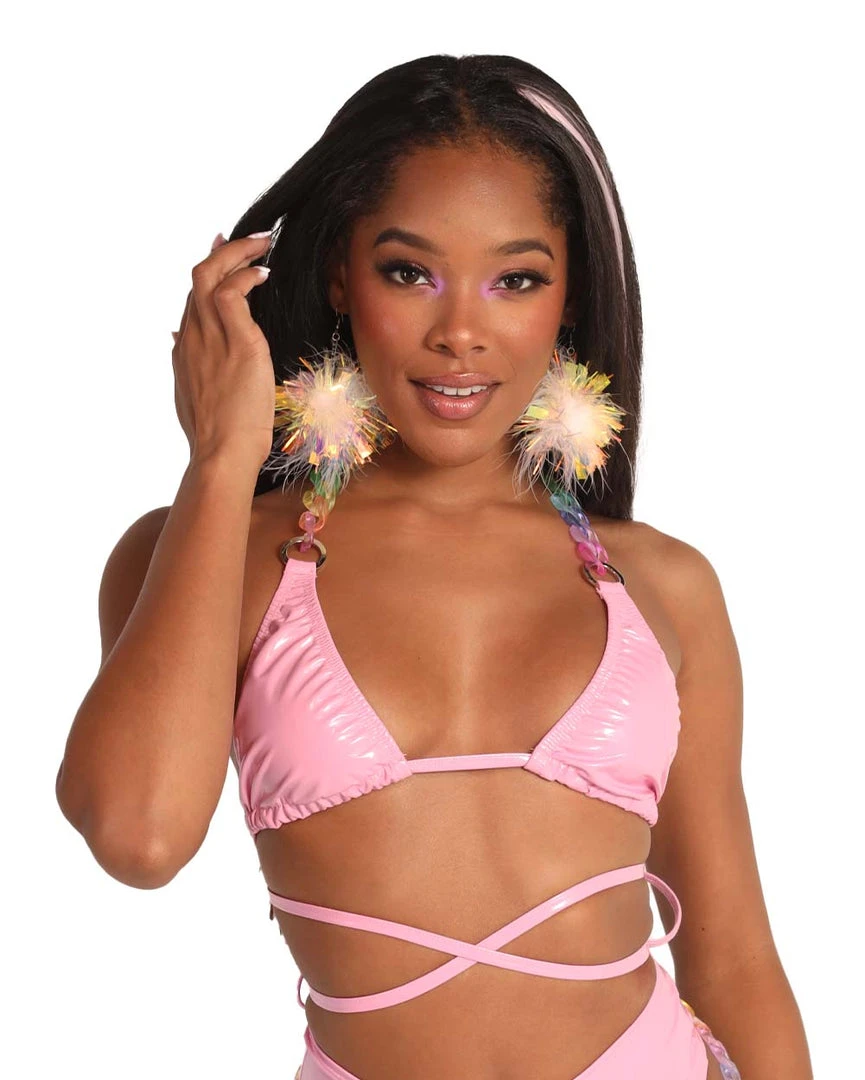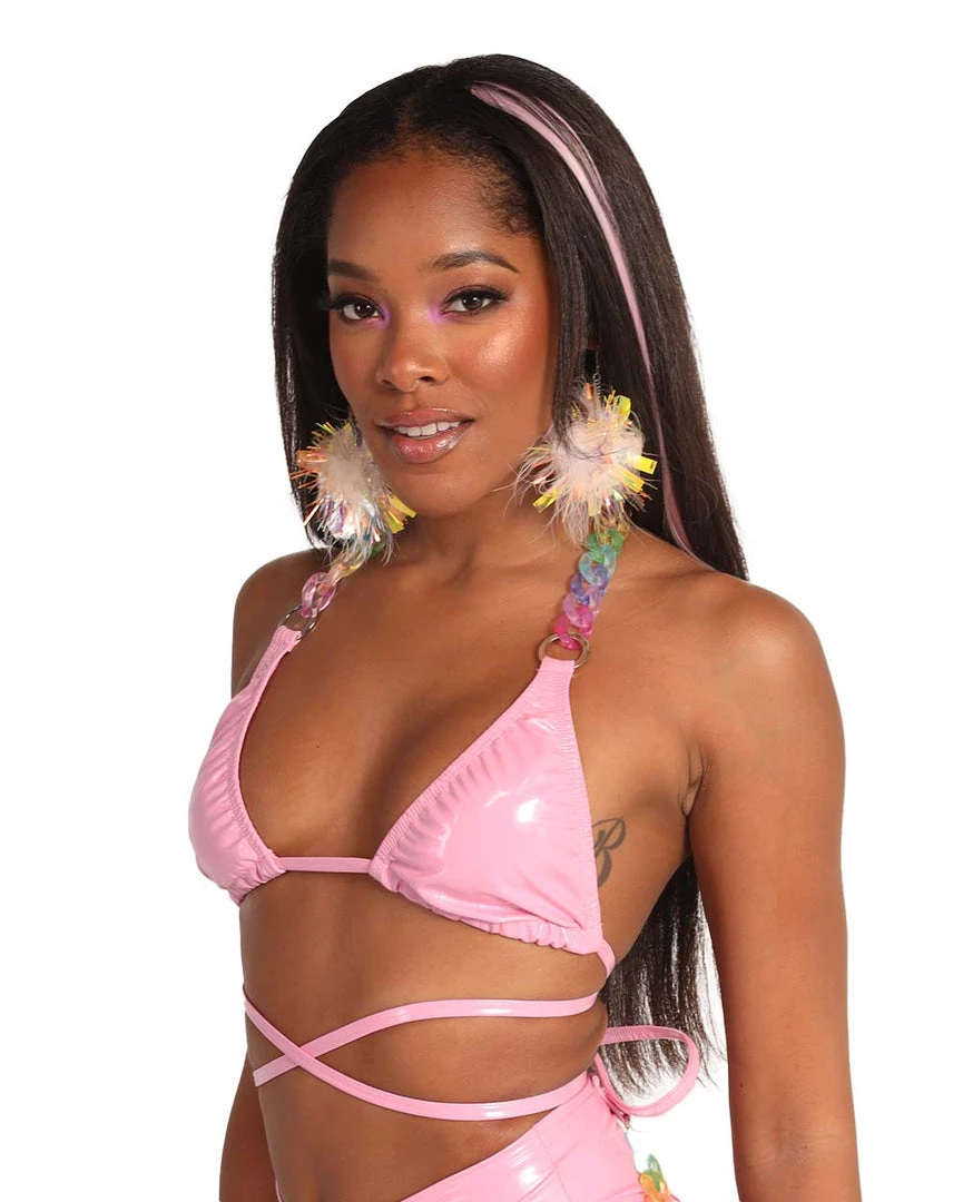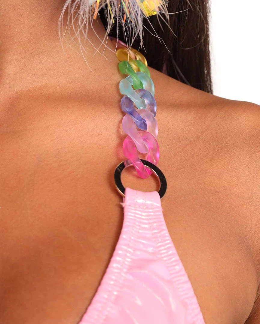 Have high expectations? Our J. Valentine Dreamtopia Vinyl Triangle Top will not disappoint. This triangle bikini top has colorful acrylic chains as straps, an ultra-plunging neckline, and straps that u can wrap however u like.
