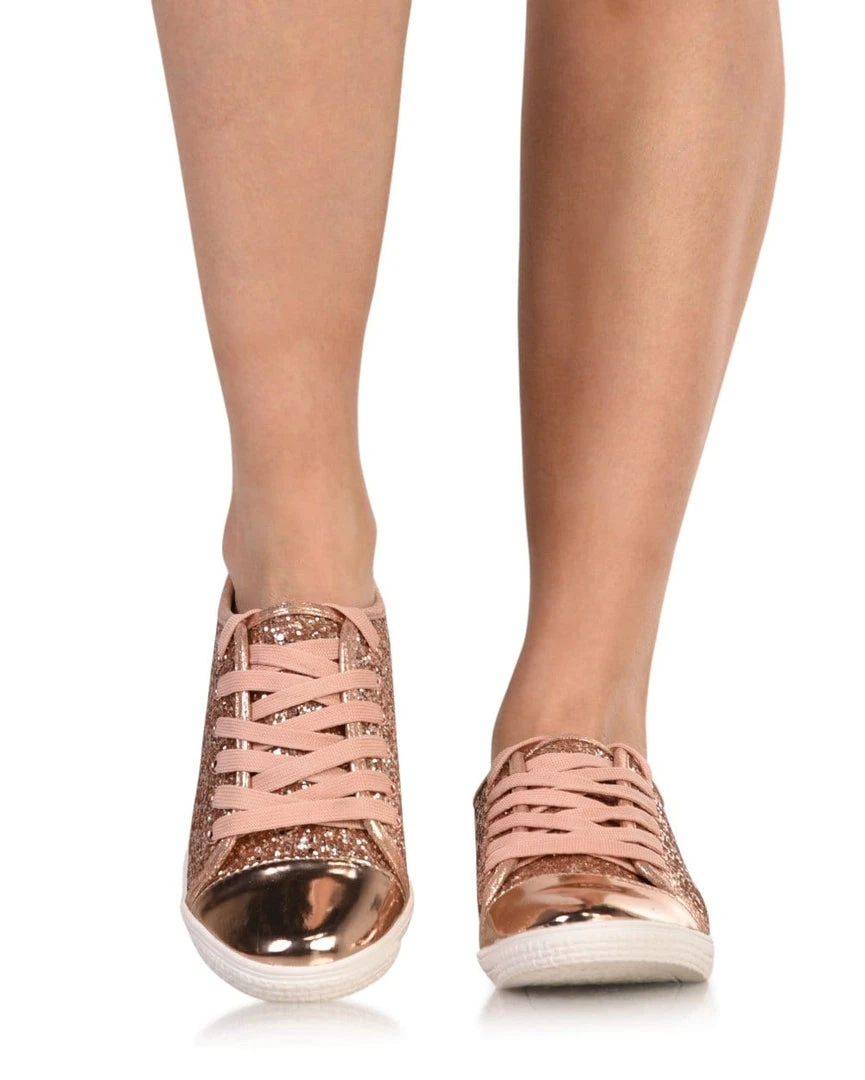 Keep sparkling everywhere you go in our Shinin’ All the Time Glitter Sneakers. These ultra shiny tennis shoes have a glitter body, metallic tie with matching laces. Offered in Rose Gold, White, and Silver.