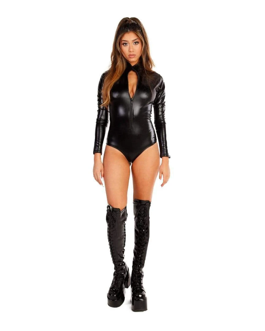 You’re ready to look sinful AF in our Wet Look High Neck Zipper Bodysuit. This sultry black one-piece is ultra form-fitted, with a high collar and a moderately cheeky fit. Show off in this long-sleeved monokini at your next fest.