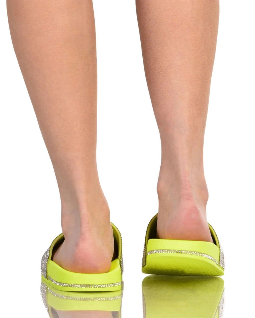 Be THAT girl in our Icy Girl Rhinestone Slides. These ultra sassy sandals come in two colorful neon looks and are accented with silver sparkling rhinestones so you can shine by the pool.