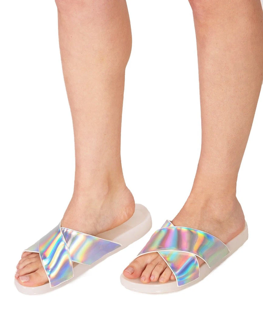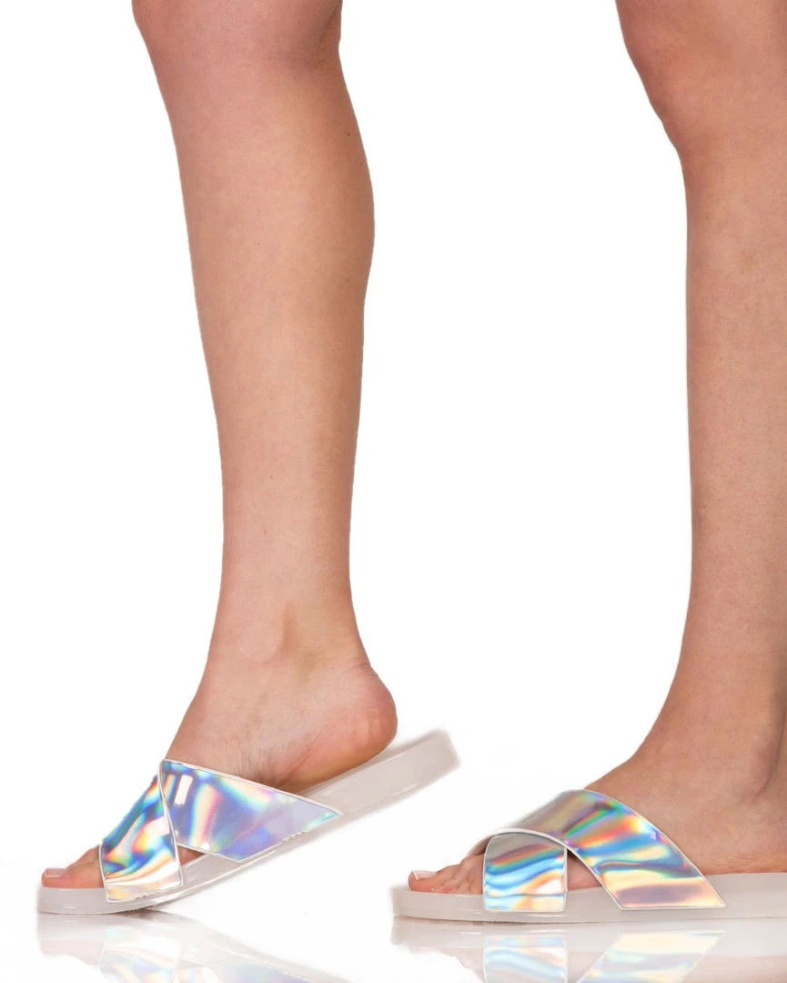 Grab a cocktail and lay pool side in our Superstar Holo Slides. These fabulous iridescent sandals have a cool cross strap detail and come in Black, Turquoise, and White.
