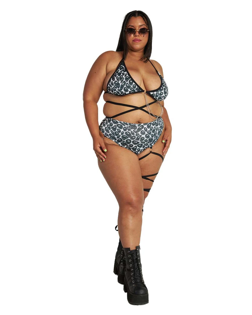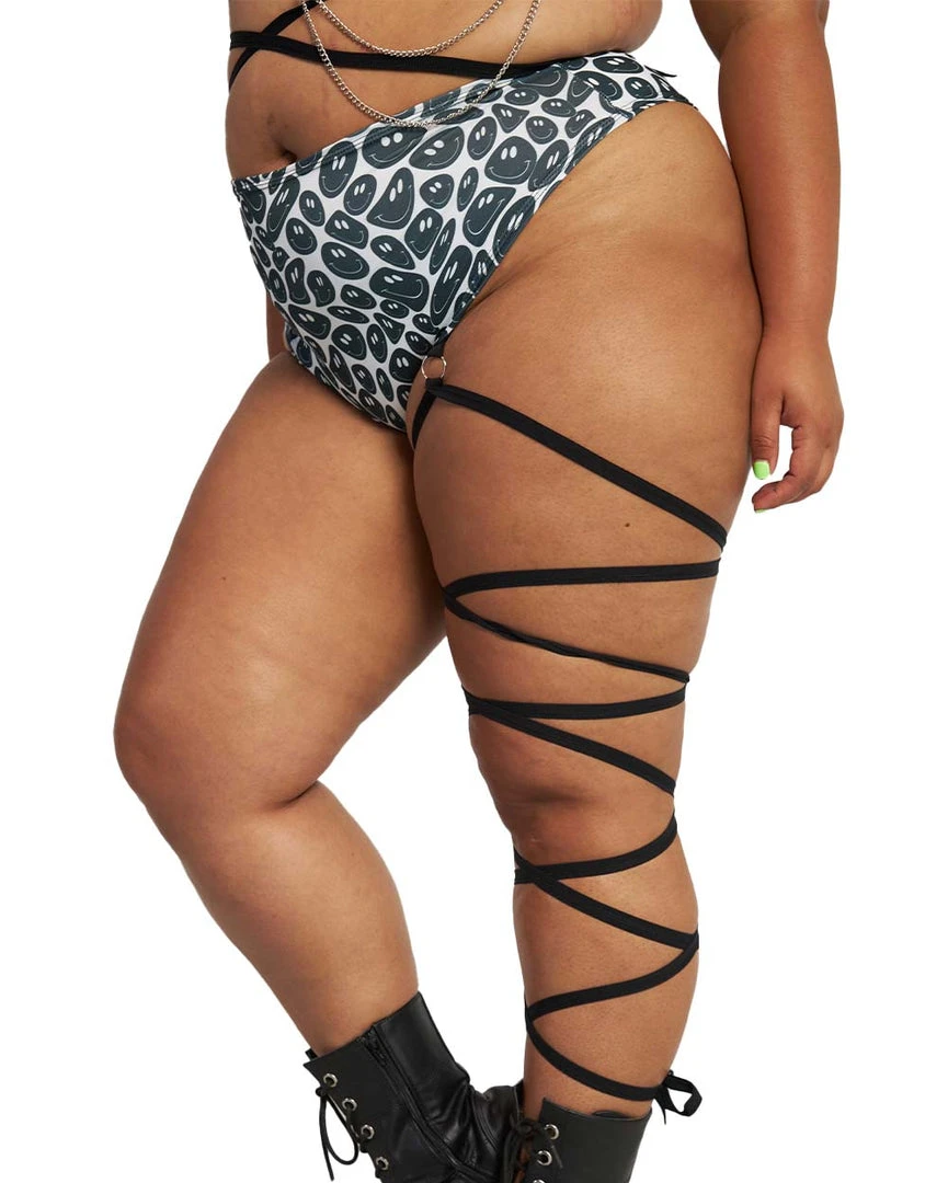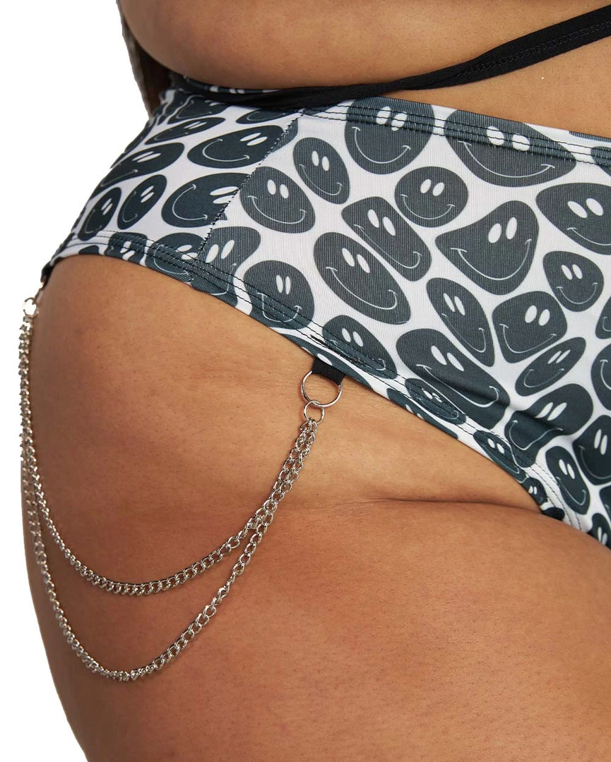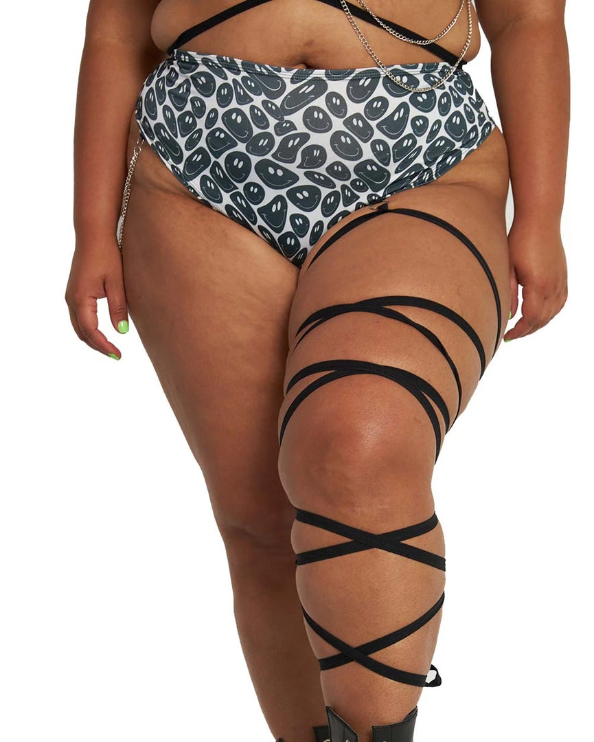 The Lyte Couture x iHR Nostalgic Smile Bottoms are quite the mood. They have a high-waisted cut, ultra cheeky coverage, and are accented with silver chains on one side, and strappy leg garters on the other.ย
