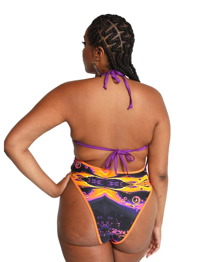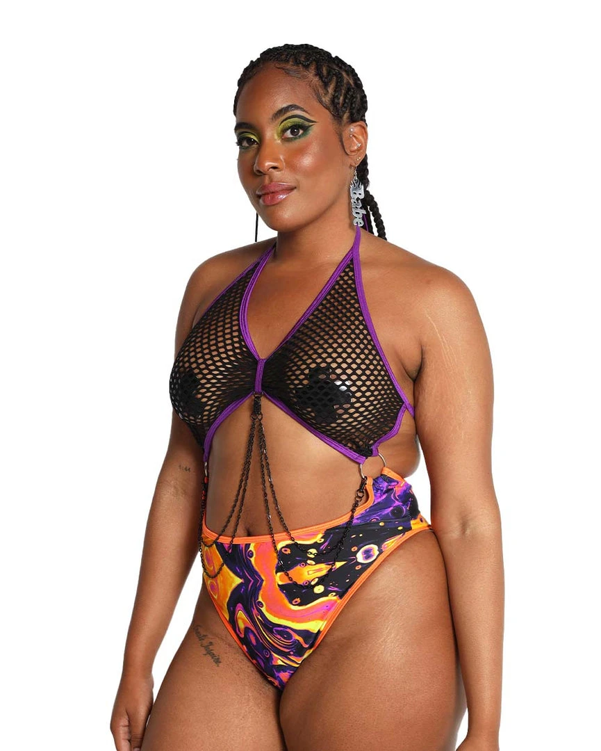 You’re a psychedelic rave babe from top to bottom with the Rolita Couture Hazard Bath Punk Princess Bodysuit. This one-piece has a fishnet top that highlights your curves, cheeky bottoms with our vibrant Hazard Bath print, and layered black chains that hang beautifully over the bodice.