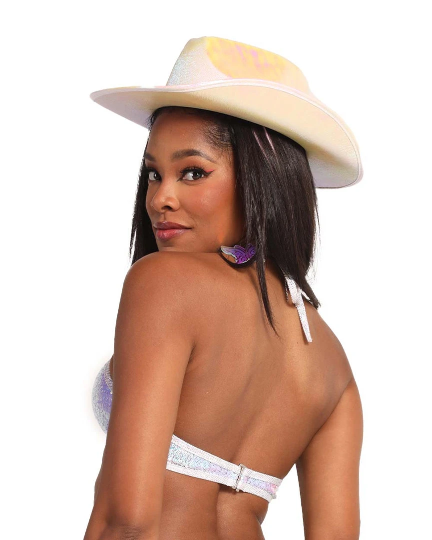 Pop off in our Roma She’s So Lucky Sequin Bikini Top. This bra top has iridescent sequins all over, a strappy design, and a keyhole cutout that accentuates ur curves.