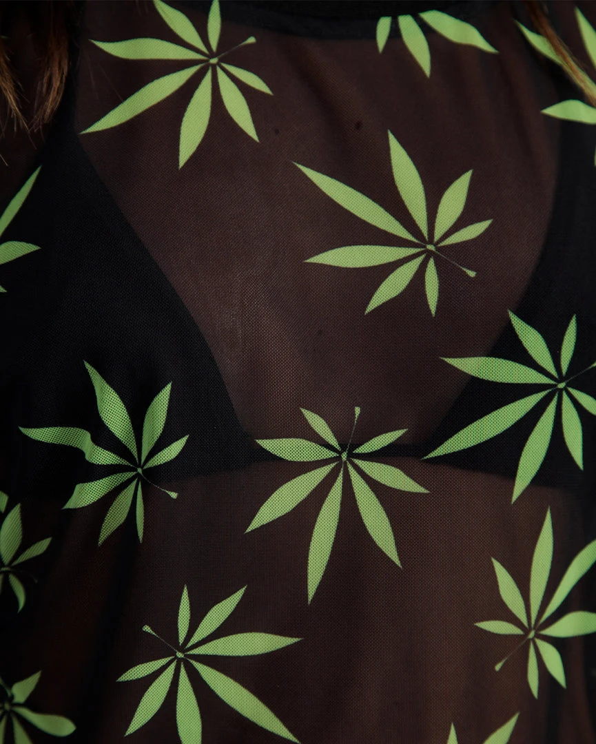 Take a hit & get ready to stunt on ’em in our 420 Hunni Weed Mesh Oversized Tee. This oversized tee features a marijuana leaf graphic and a see-through material that allows u to show off ur fav reflective pasties underneath.