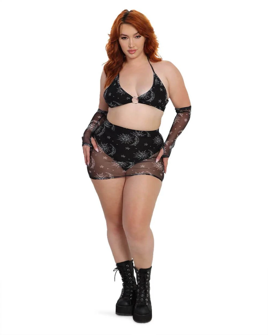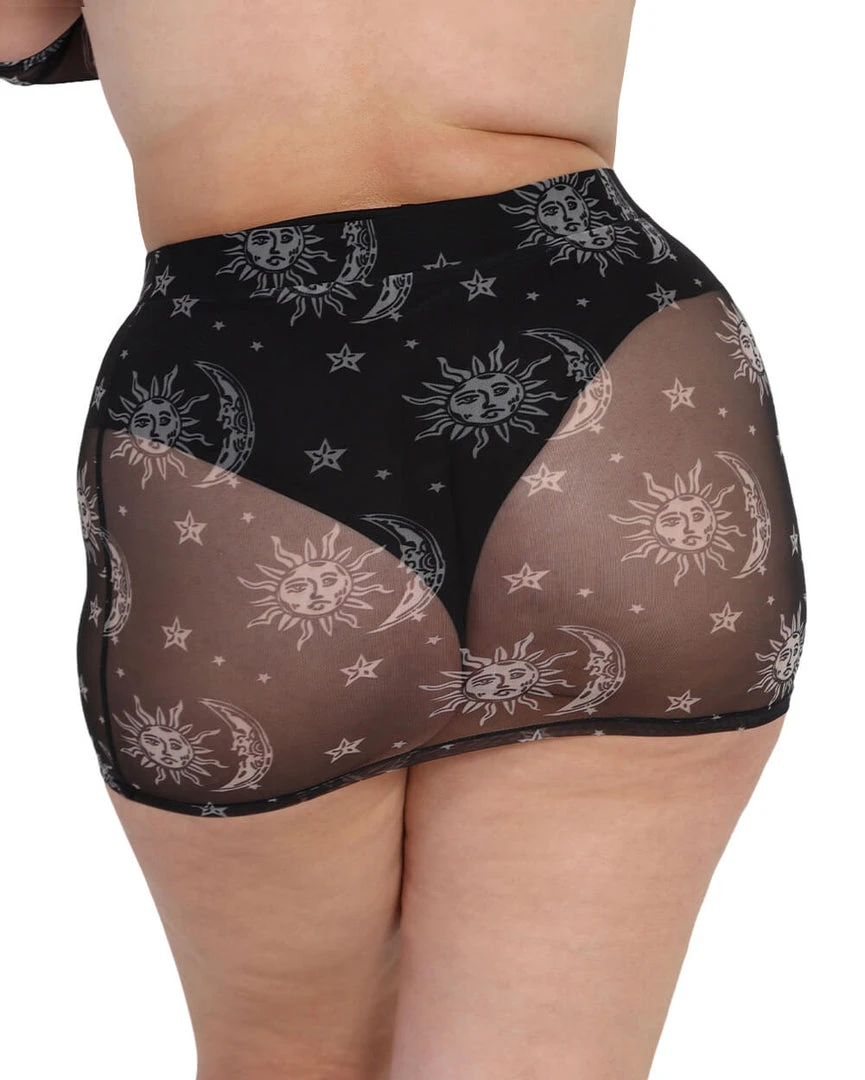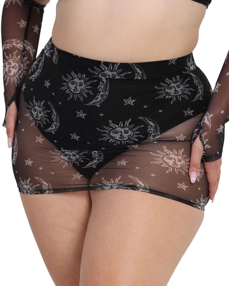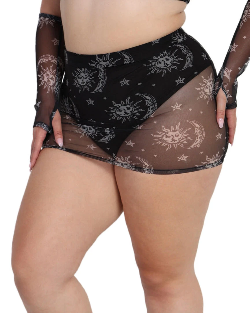 Embrace the starlight hour in our Celestial Cutie Mesh Mini Skirt. This mesh skirt features a high waist cut and a mesmerizing moon, stars, and sun print all over. Finish off the look with a face mask rave, and you’re ready to slay.