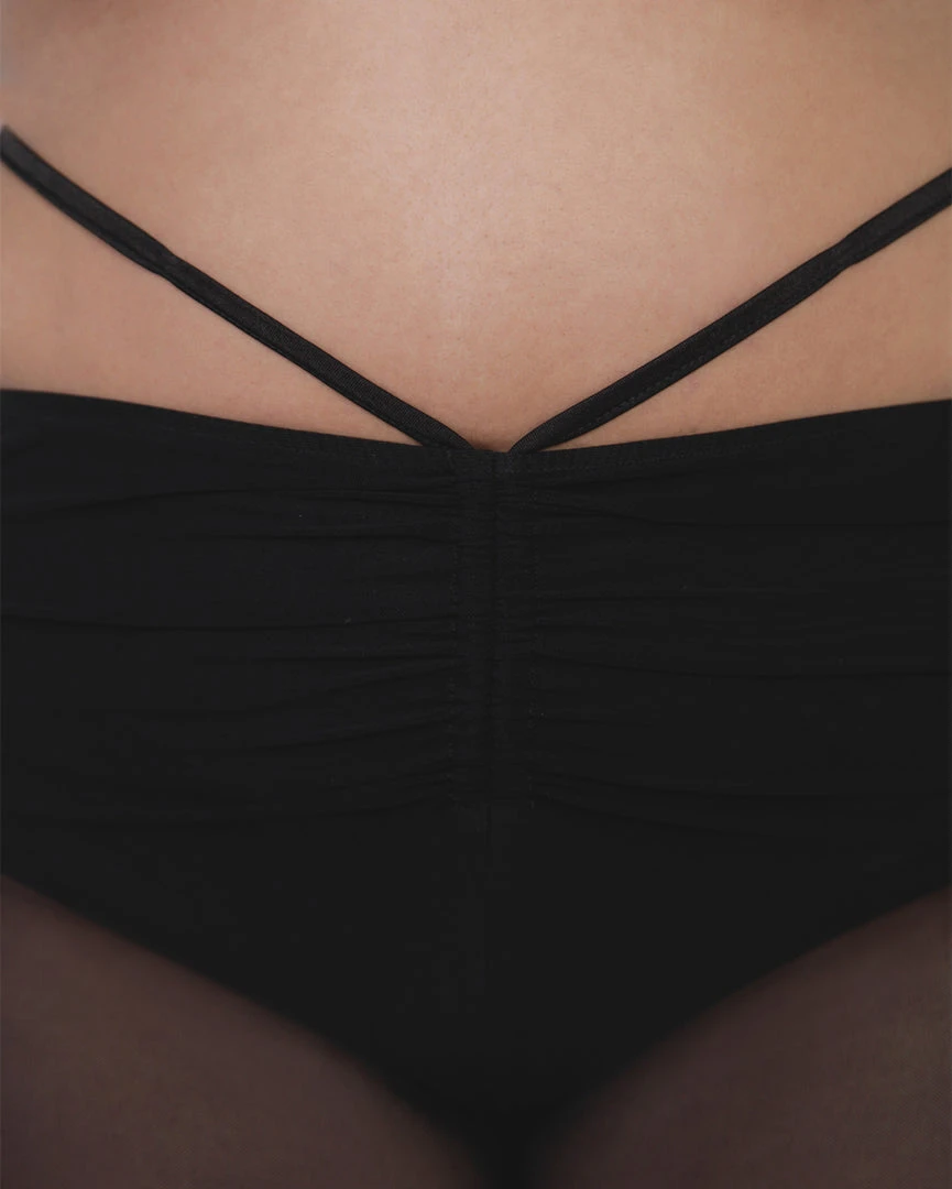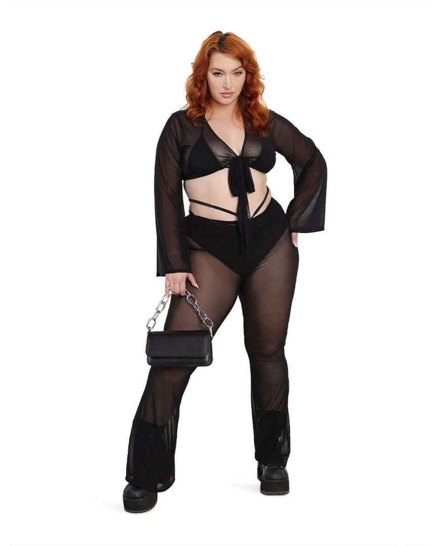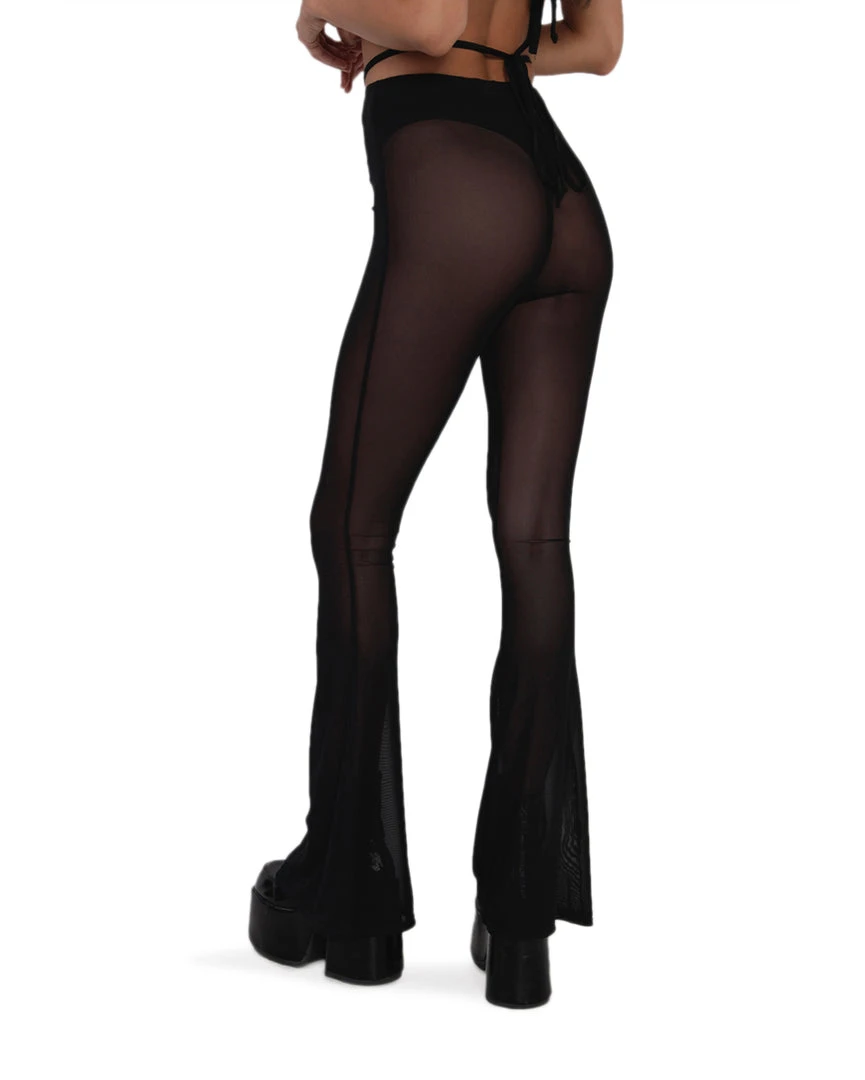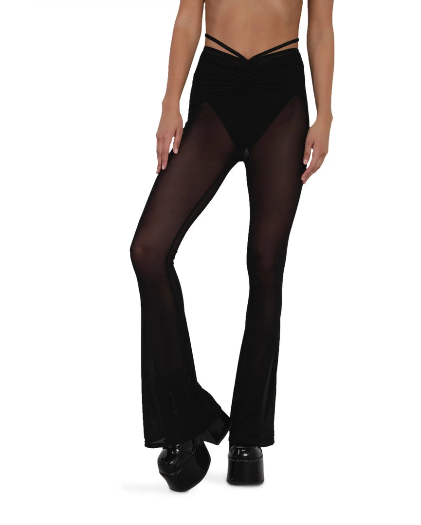 Relive ur favorite Y2K moment in our Disco Baddie Bell Bottoms. These black mesh bell bottoms have super flared legs, a high waist fit, a ruched front, and straps that u can wrap however u like. Wear it with a cute top or reflective festival pasties to complete ur look.