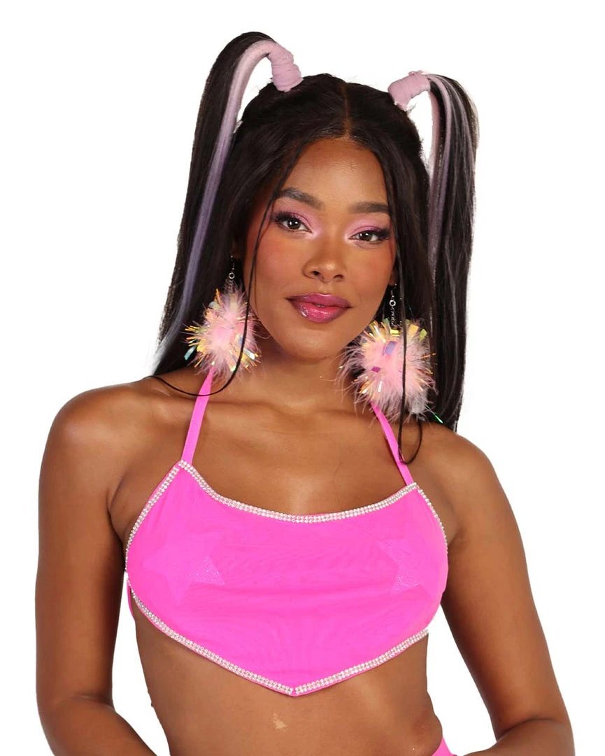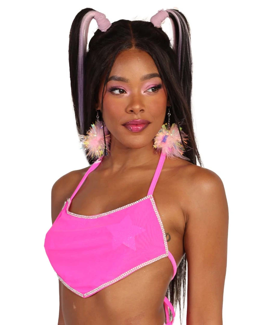 Make an electrifying statement with our Hot Pink Frequency Rhinestone Halter Top. This bandana-style mesh top has a halter neckline, an open back, and a rhinestone-encrusted trim. Pair it with its matching skirt for an absolutely spotlight-stealing.ย