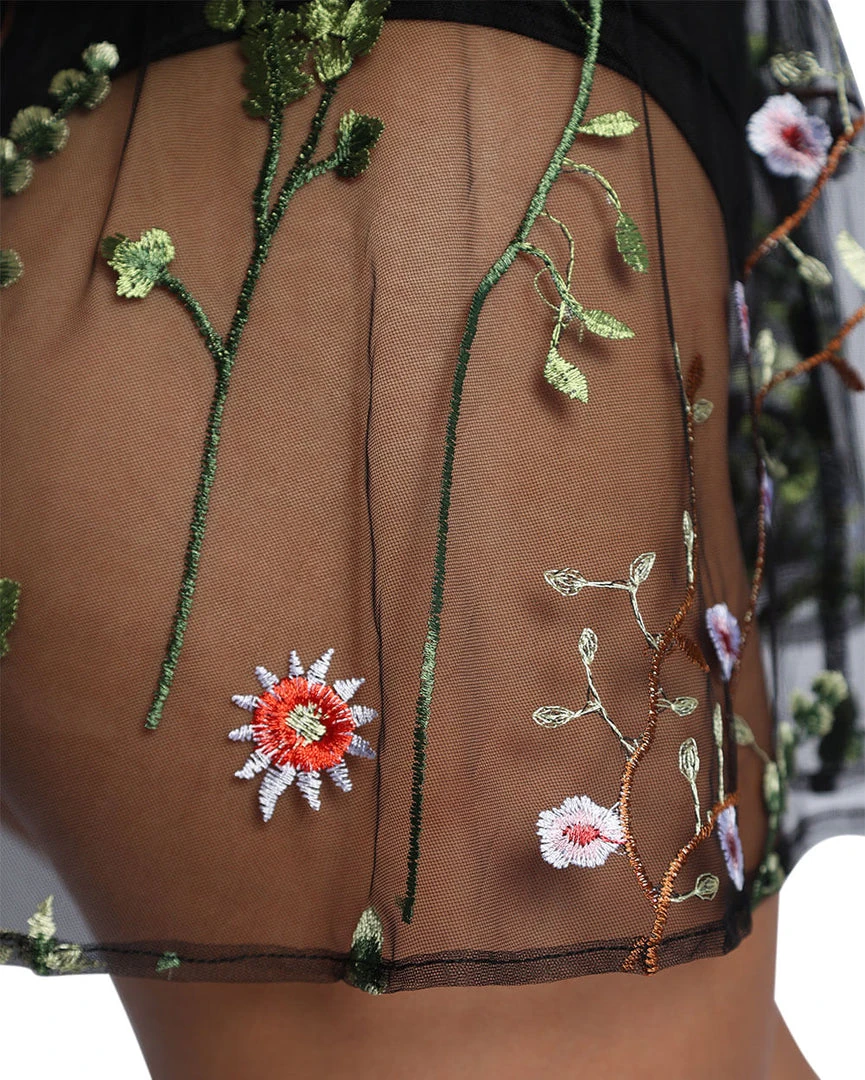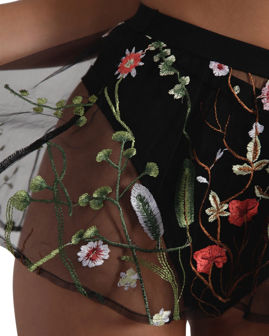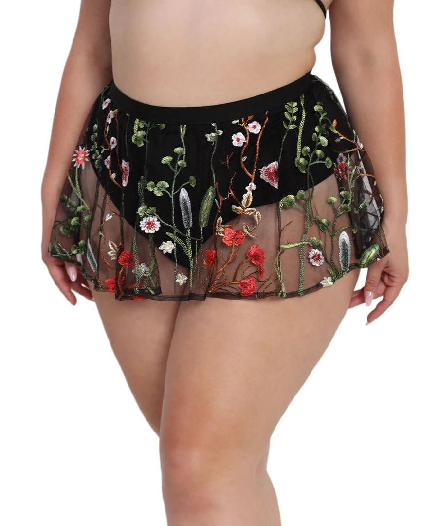 Let ur happiness blossom in this Lace Flowerfields Mesh Mini Skirt. This see-through, flowy skirt features embossed ferns, red flowers, and butterflies, and will look impeccable with rave fishnets.
