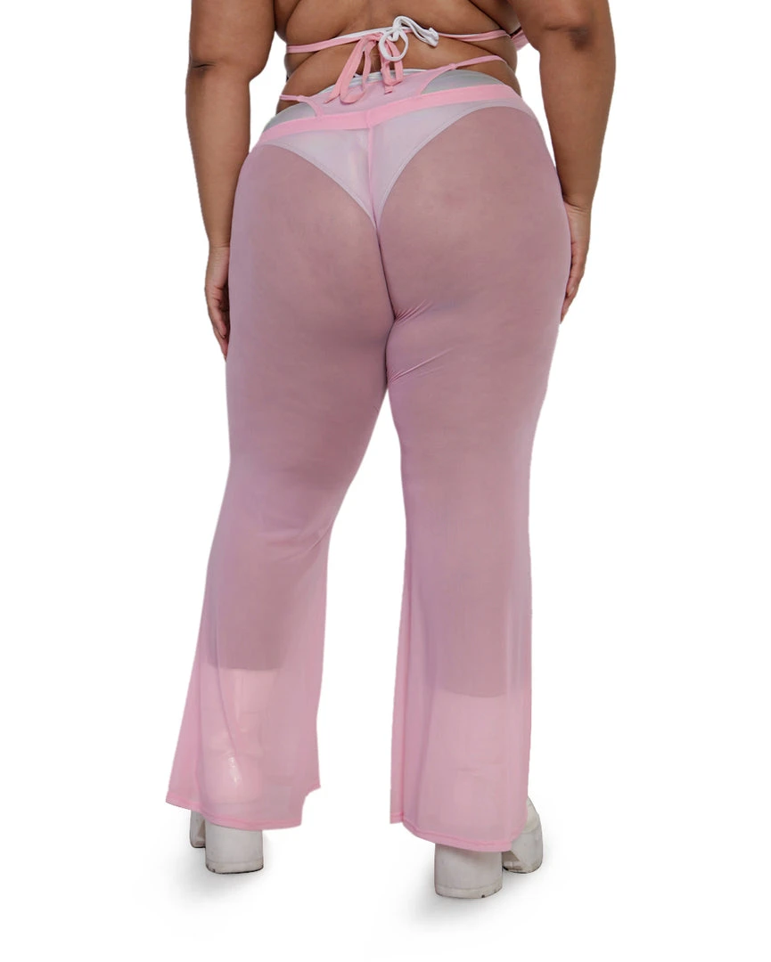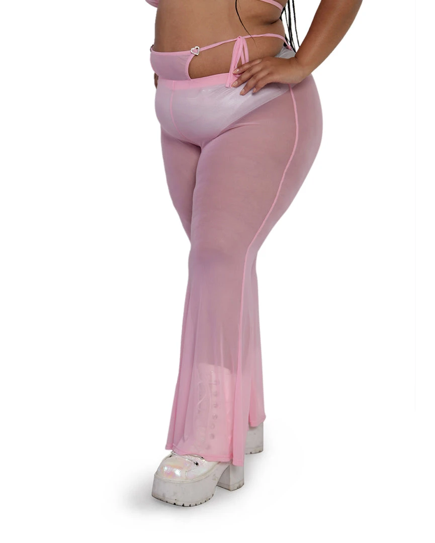 The PLUR Cuteness Mesh Bell Bottoms will sway with the rhythm of ur dance and will impress people with their side ruffles. These bottoms come in a light pink shade and are made from a breezy, see-through material.
