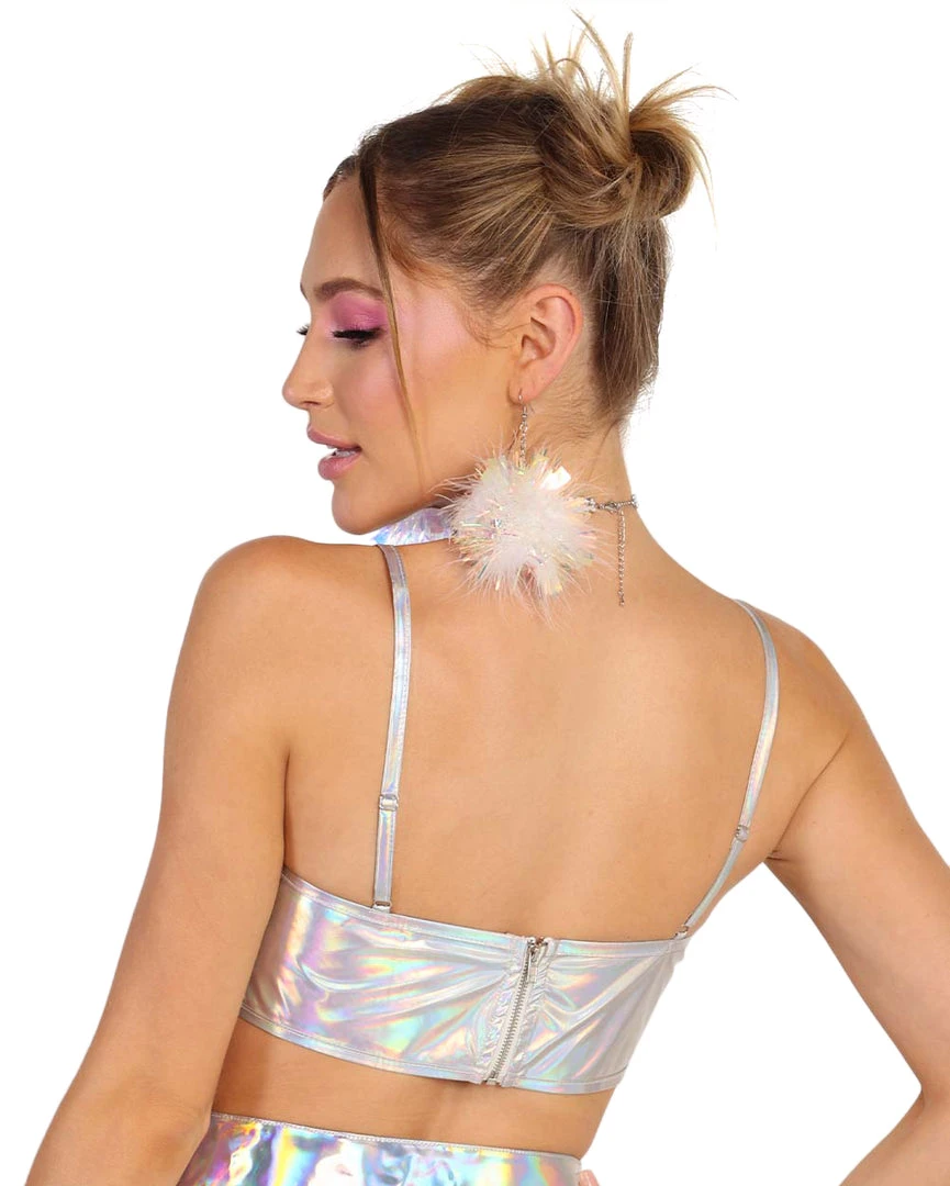 Trigger a nostalgic feeling with the Stargirl Holo Corset Top. This cropped top has a body-hugging fit, skinny straps, and a holographic finish that draws the rainbow spectrum with the changing of the light.ย