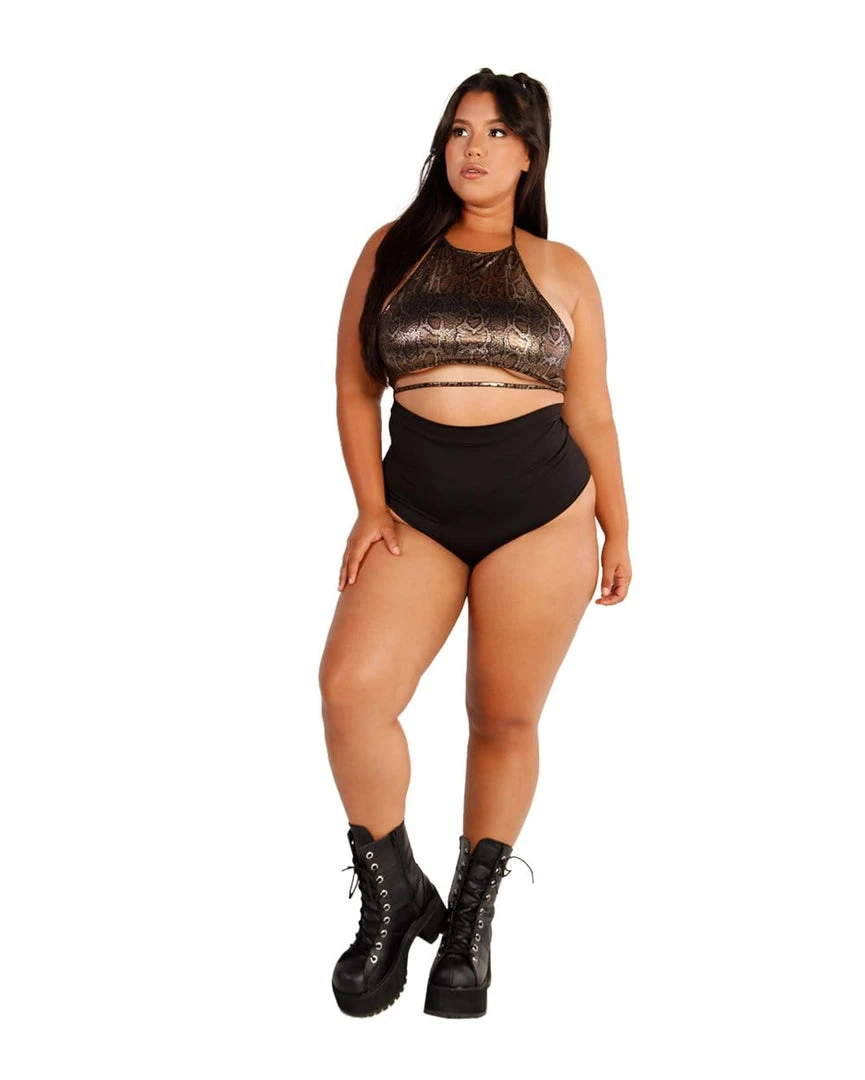 You’ll be blowin’ up everyone’s timelines in our Shimmering Snakeskin Underboob Top. This sassy and edgy snake print top is a halter top fit with a tasteful underboob cut out and adjustable tie detail.